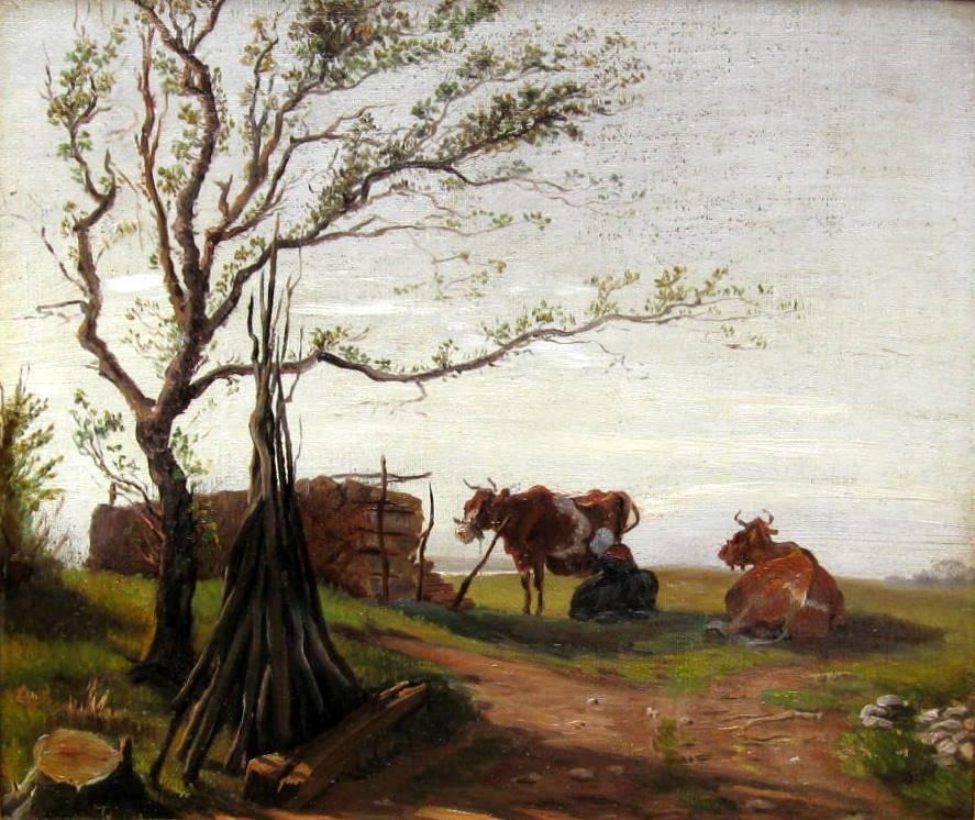 Dansk kunstner (19.årh): En kvinde malker køer.