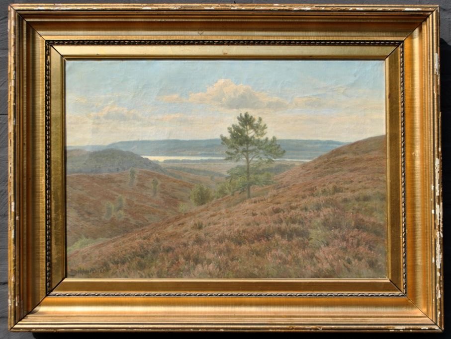 Birkhammer, Axel Johannes Emil (1874 - 1936) Danmark: Hedebakker ved Svejbæk. I baggrunden Himmelbjerget. Olie på lærred. H: 46 cm. B: 67 cm. Signeret: A Birkhammer.
