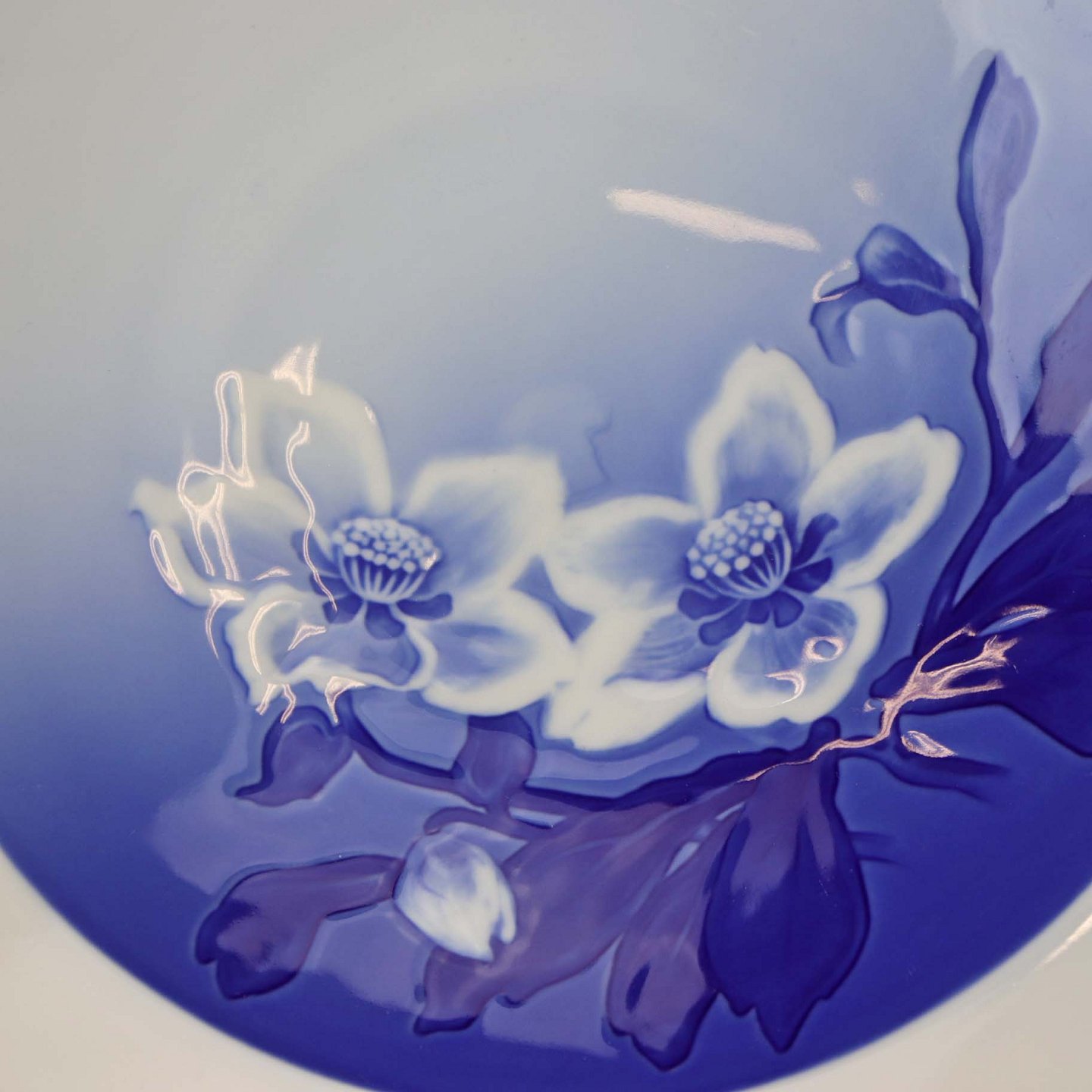 Julerose er hvidt porcelæn med gradueret blå farver, dekoreret med et motiv af en hvid julerose