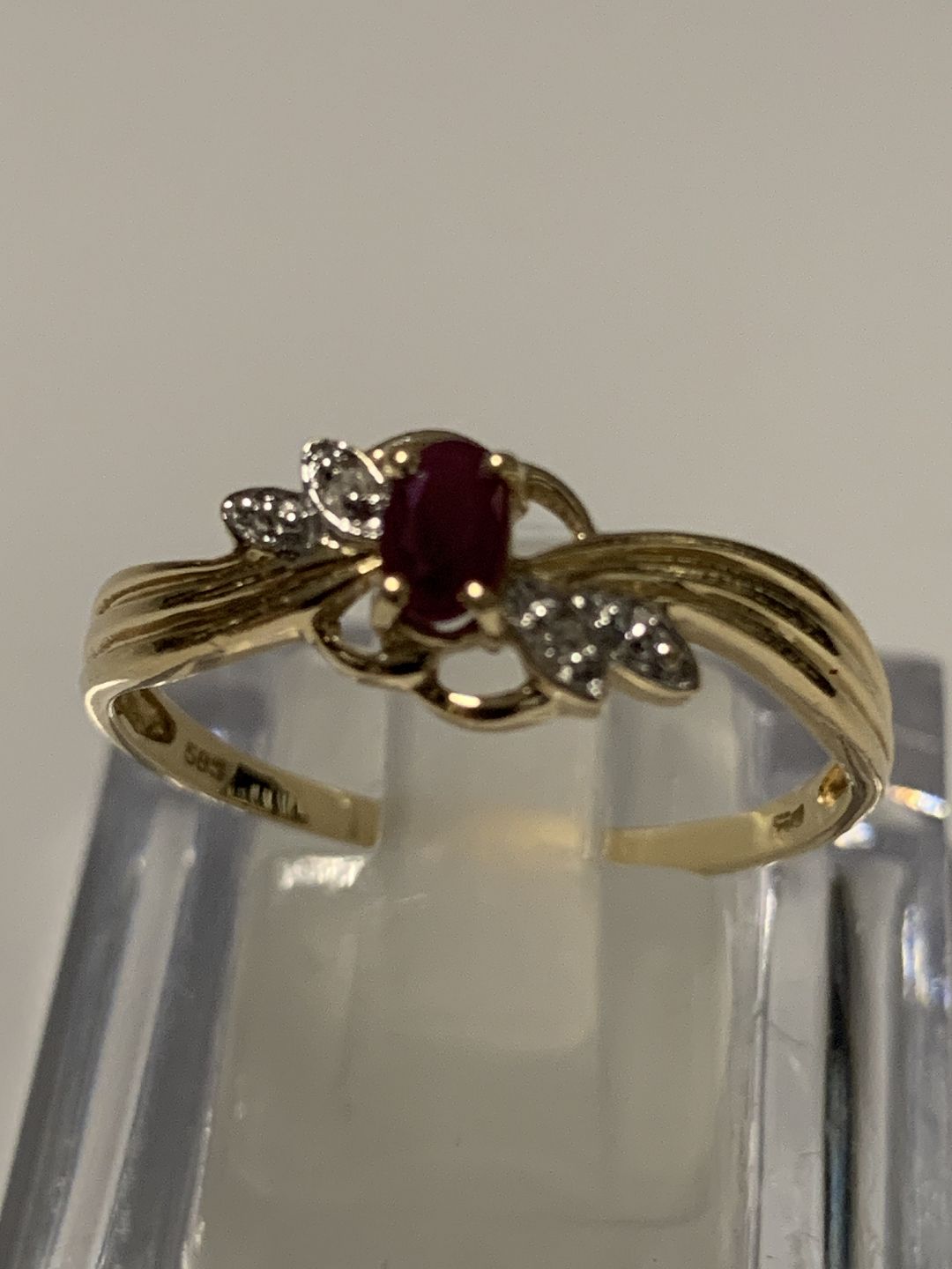 Flot Damering, med en rød rubin samt indlagte diamanter, i 14 karat guld.