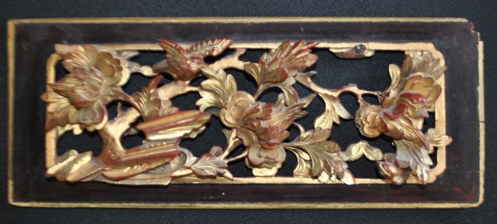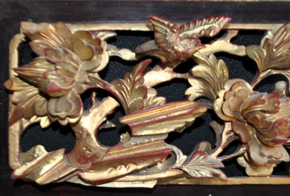 Red-painted Chinese woodcut with gilding, 19th century. Cuts in the form of foliage and small birds. 15 x 38.5 cm.