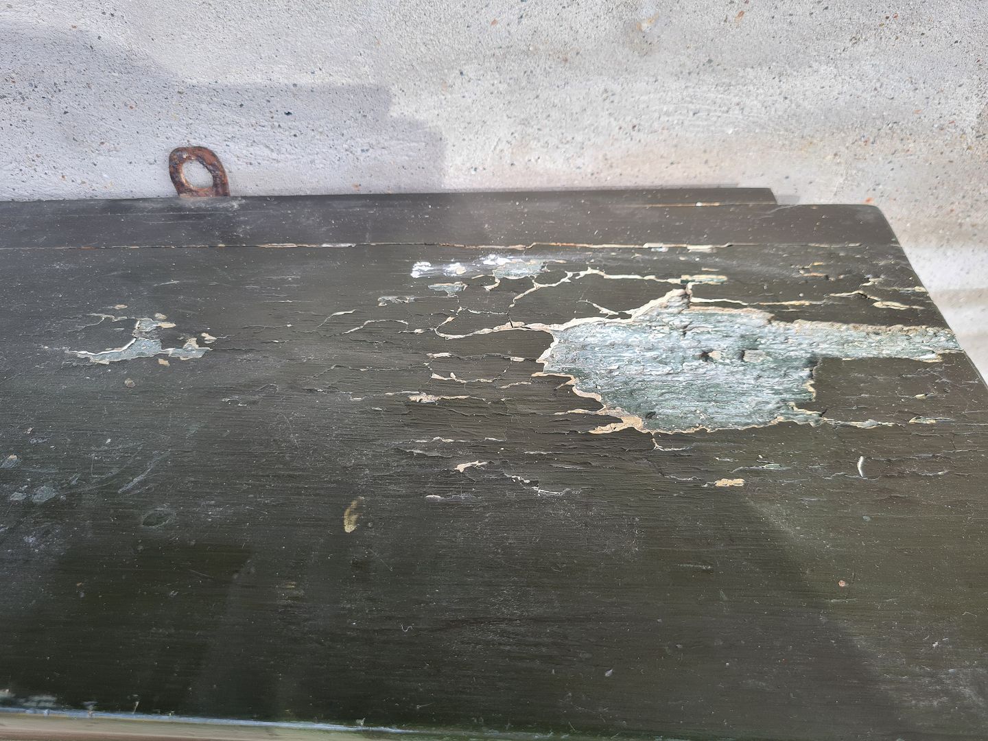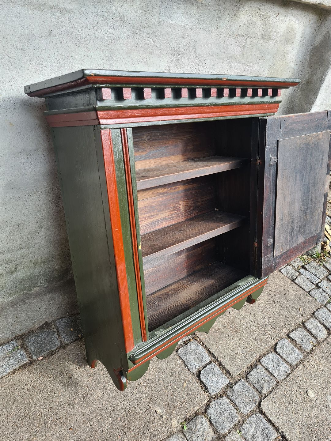 Malet vægskab fra 1920´erne. Pænt og udmærket funktionsdygtigt. Dog med en skade i kitten på toppen. (billede)