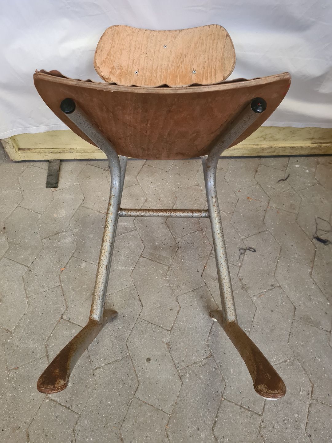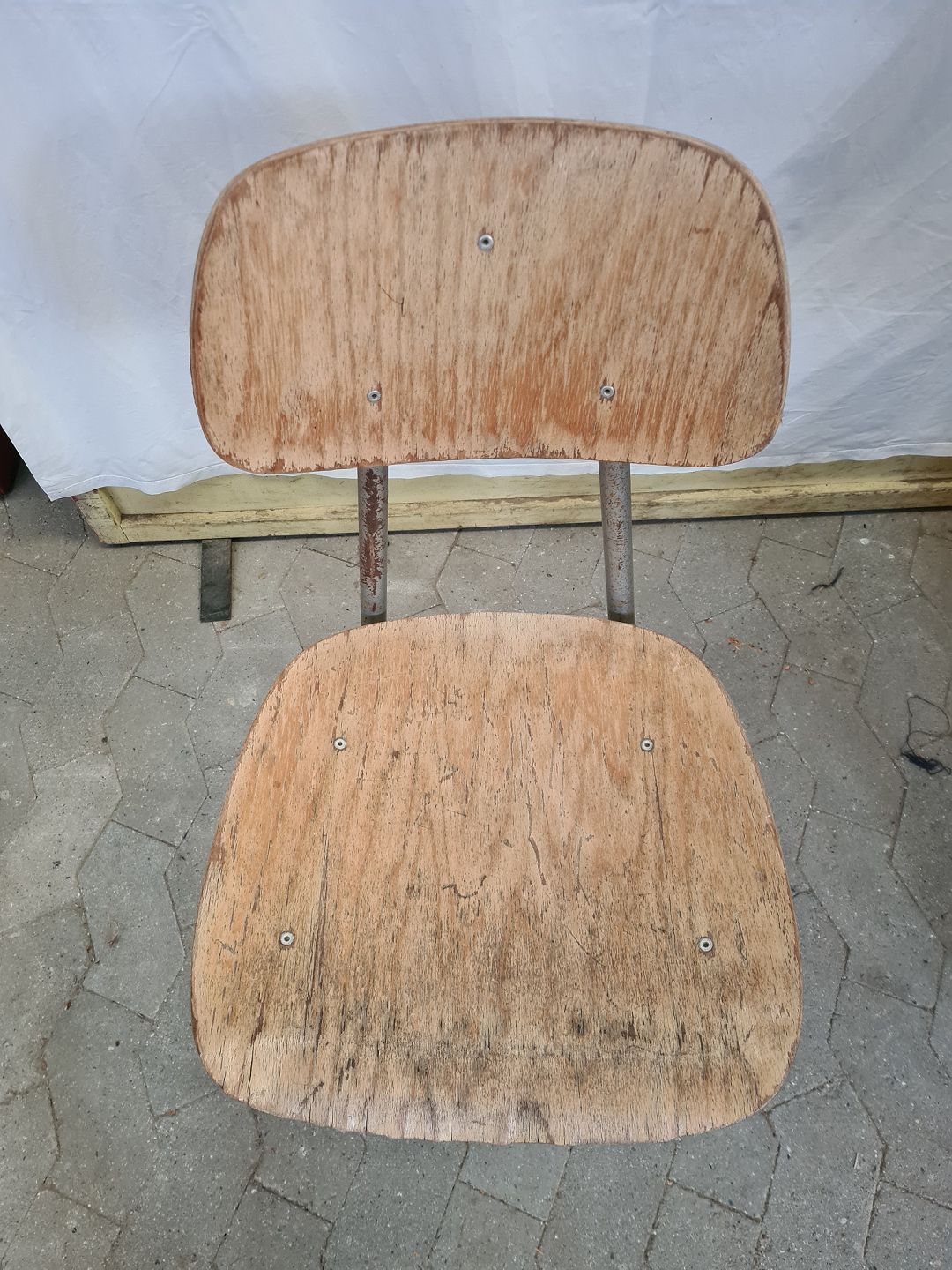 Stol i metal med krydsfiner, fra 1960erne.
