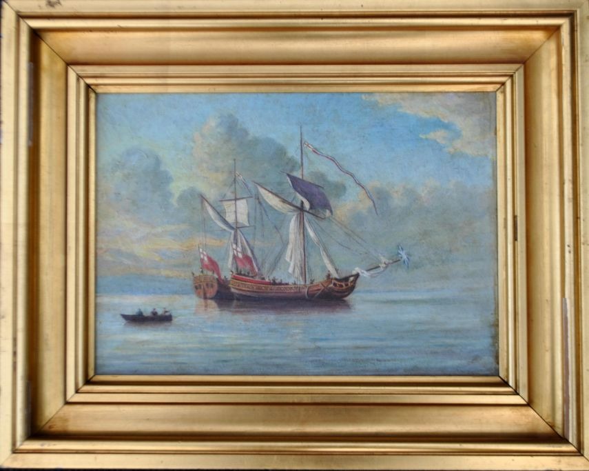 English artist (19th century): Two English ships meet at sea. Oil on canvas. Indistinctly signed. 24 x 34 cm. Framed: 36 x 46 cm.
