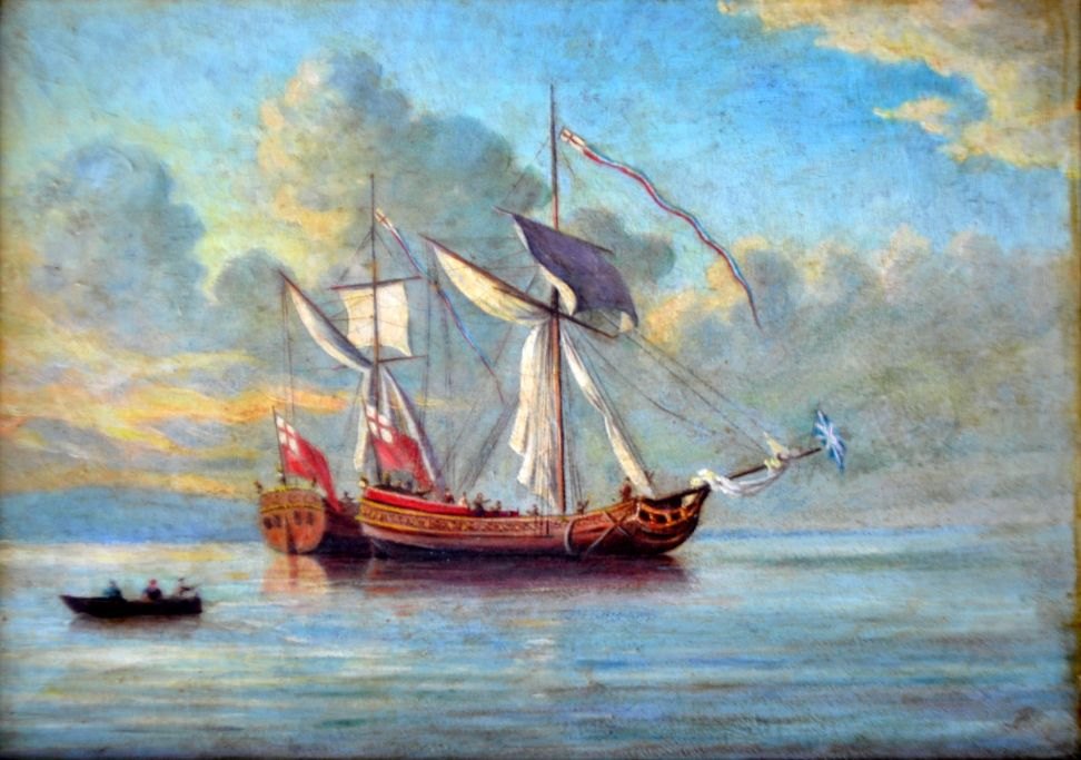 English artist (19th century): Two English ships meet at sea.