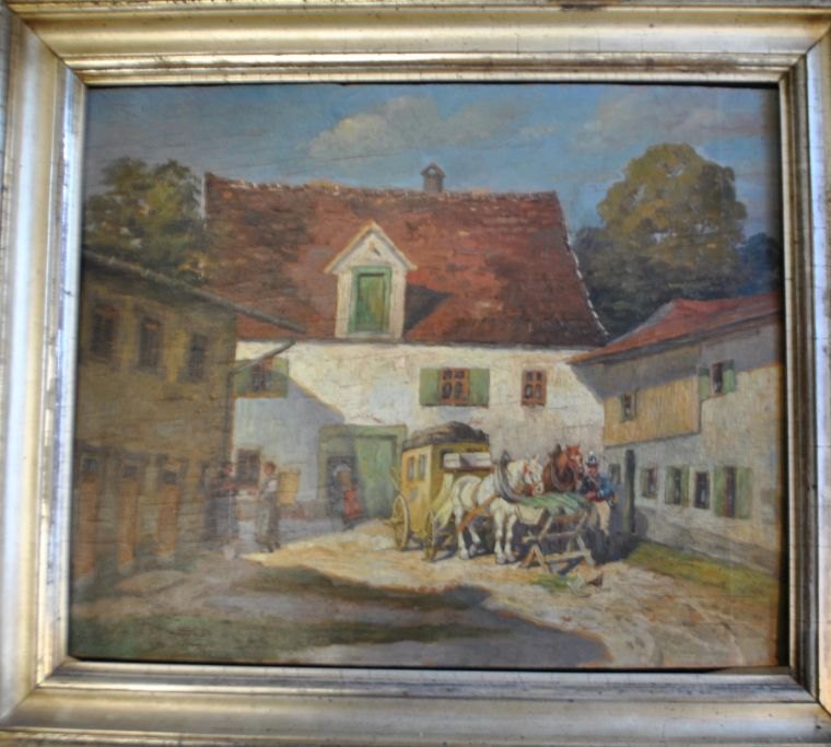Götz - Räcknitz, Paul (1873 - 1952) Tyskland: Middagshvil i en gård - med Postvogn. Signeret: Paul Götz-Räcknitz, München. Olie på træplade. 32 x 40 cm.