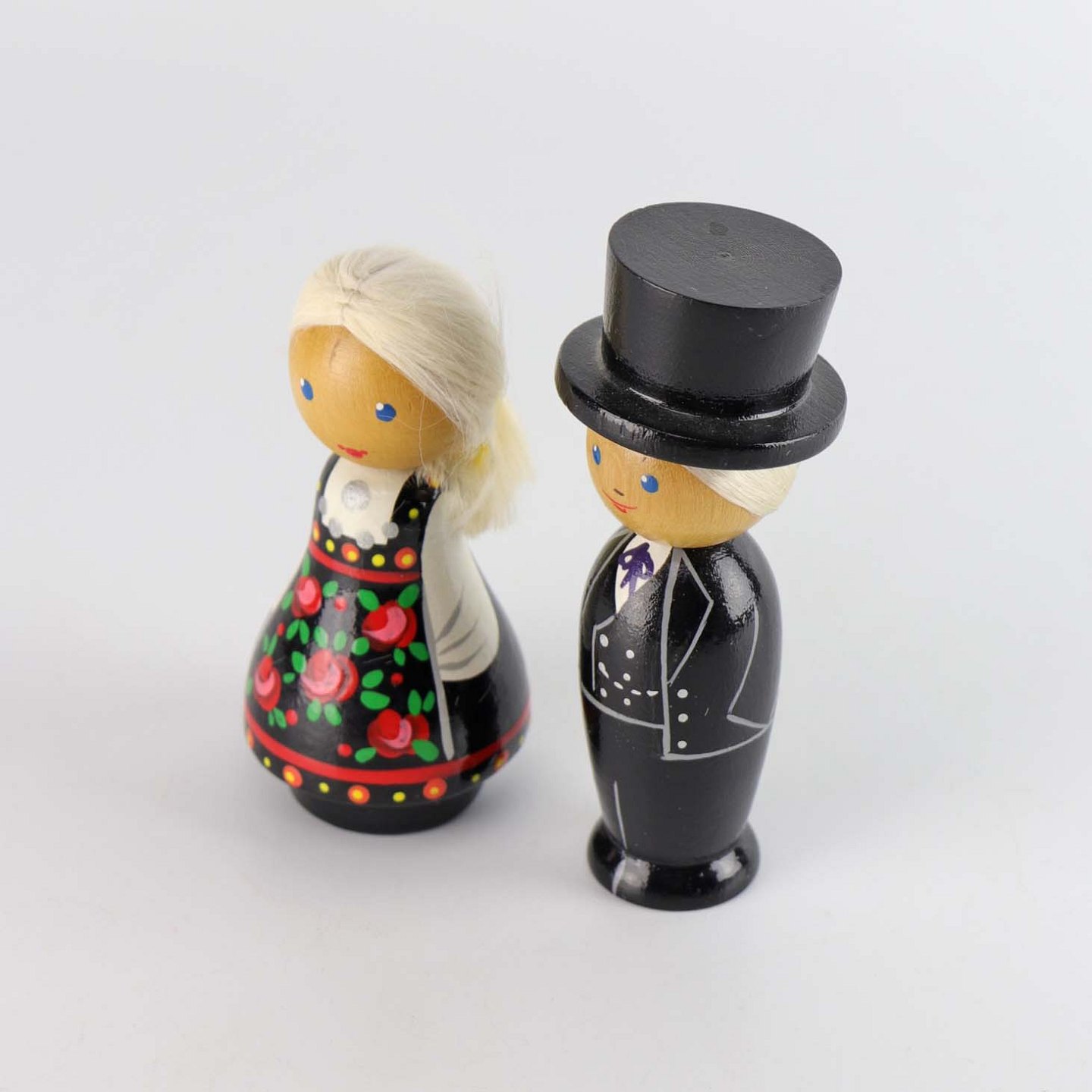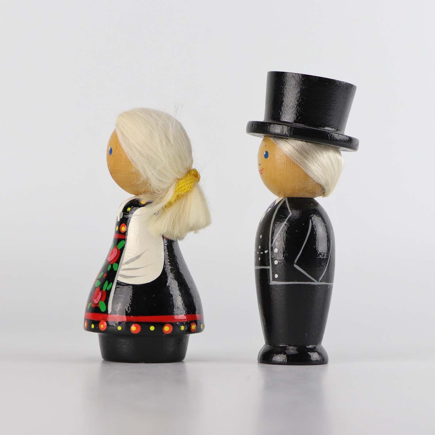 Et sæt med to figurer i malet træ med motiv af mand og kvinde i egnsdragter