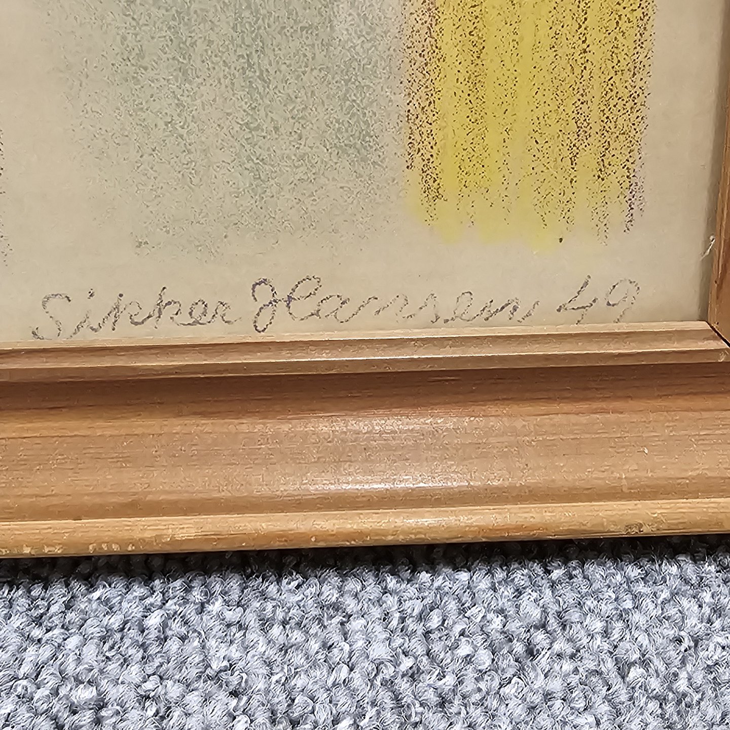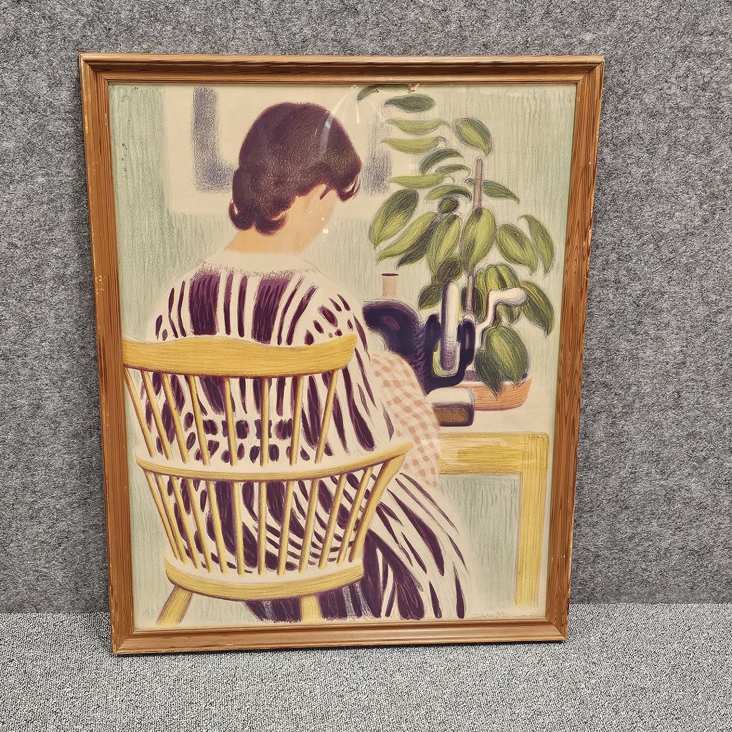 Tryk på papir med motiv af en kvinde med ryggen til, siddende ved en symaskine