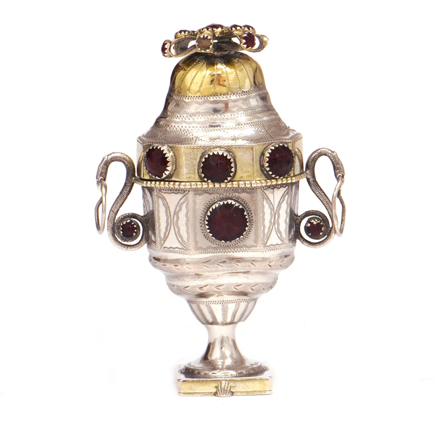 Hovedvandsæg i delvist forgyldt sølv prydet med flusser af Peter Jacobsen, 1818-75, Haderslev. H: 9,5cm |