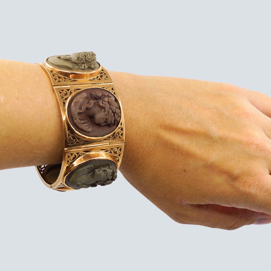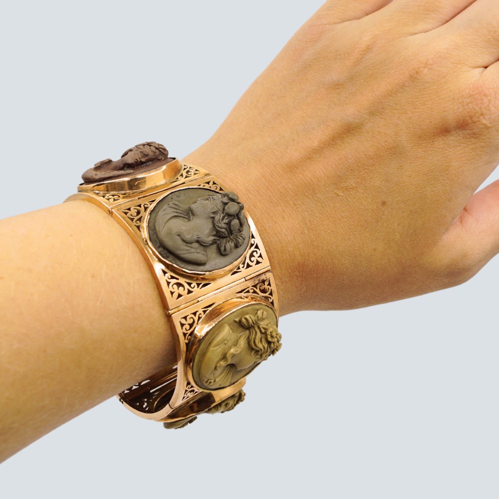 Bredt antikt Grand Tour armbånd i 14 kt. guld prydet med klassiske ansigter skåret i lavasten. Monteret med kasselås.