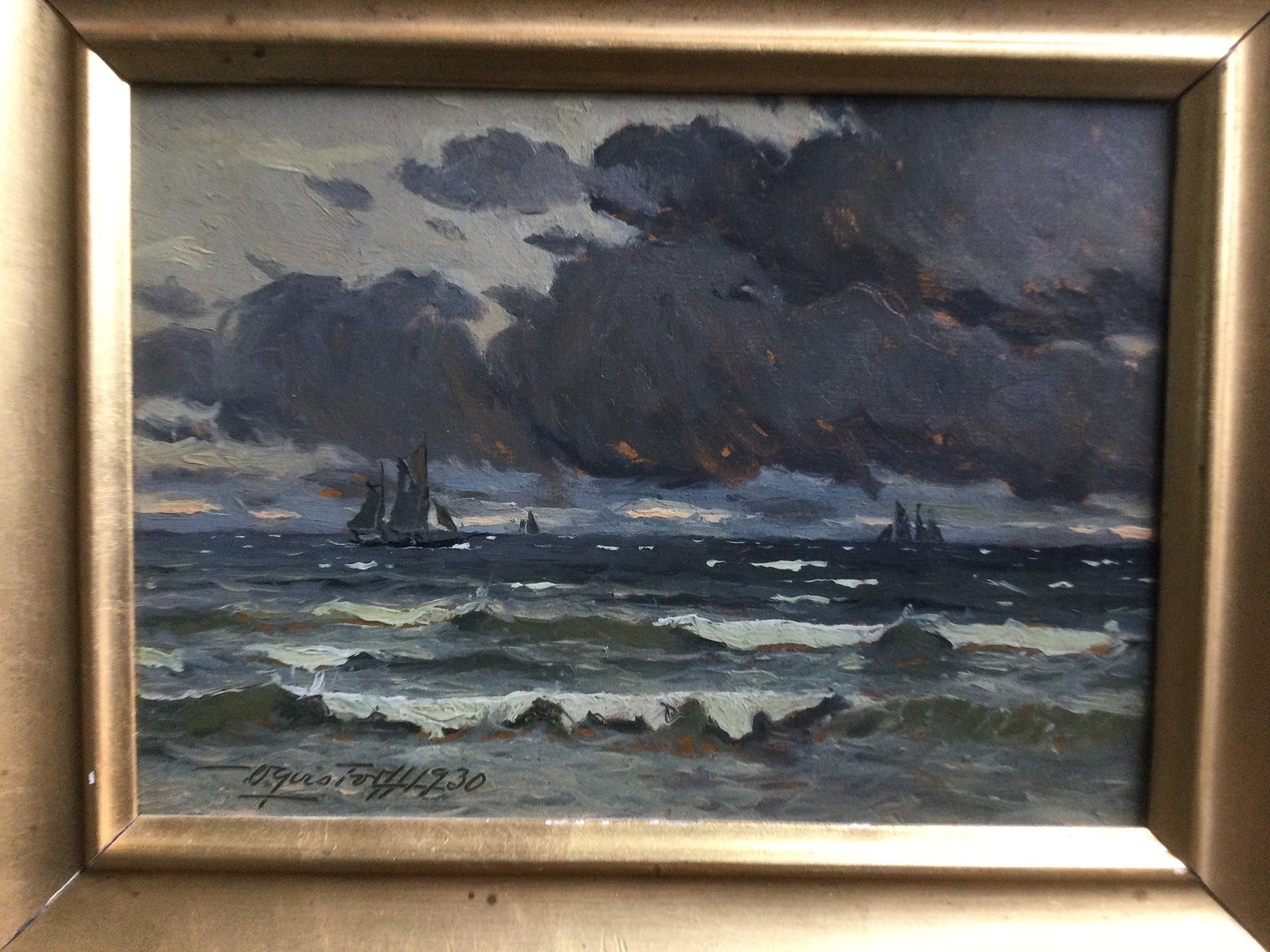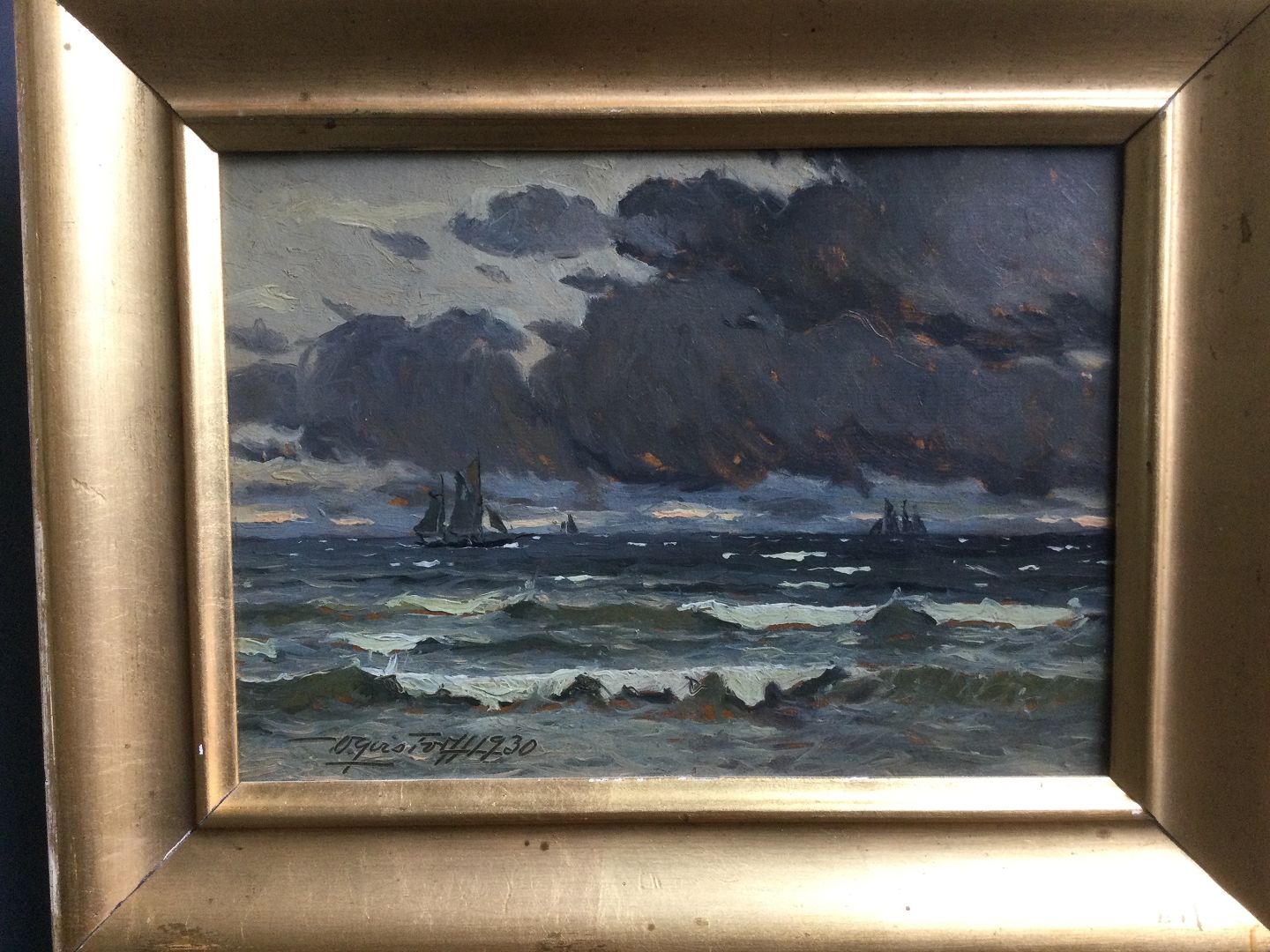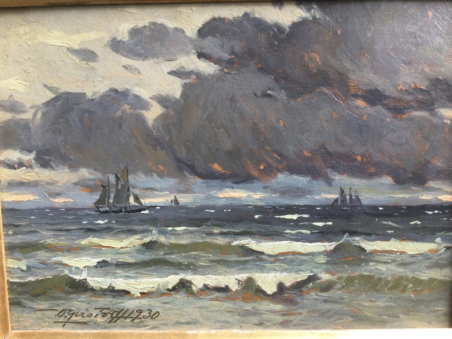 Maleri af Victor Qvistorff 1930 - Sejlskibe på vandet ud for kysten.