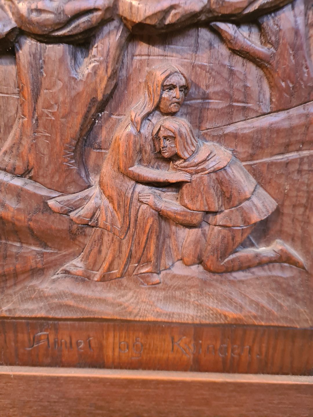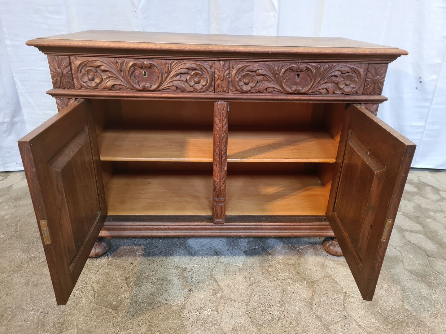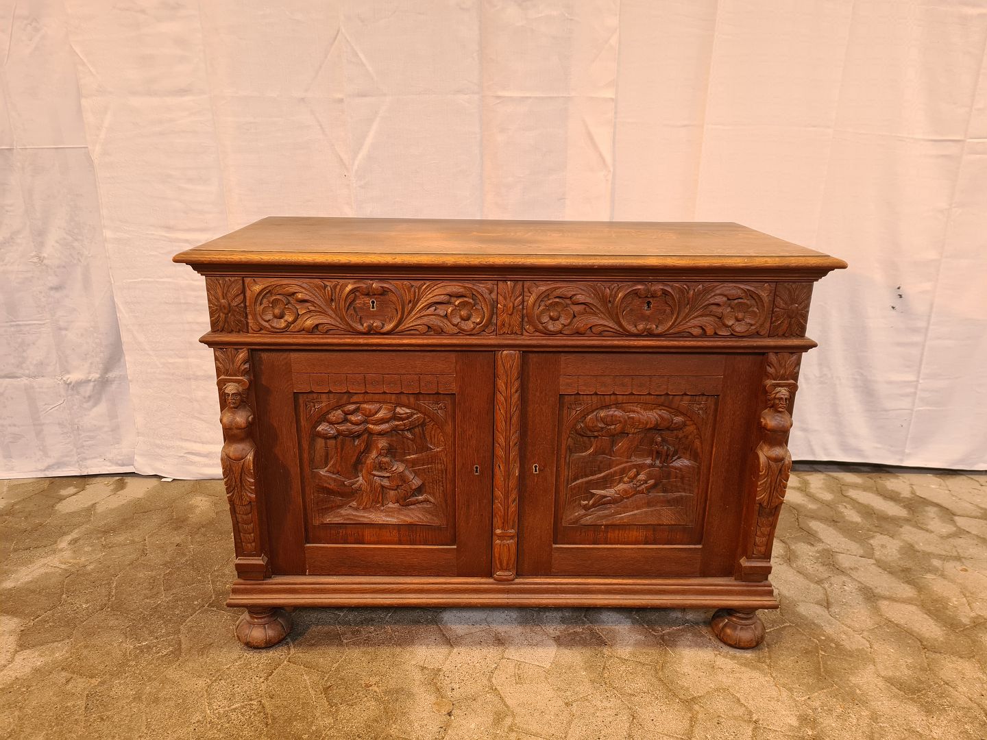 Text available in Danish: Anretterskab i fineret og massivt egetræ med motiver af Hamlet, fra 1930erne.