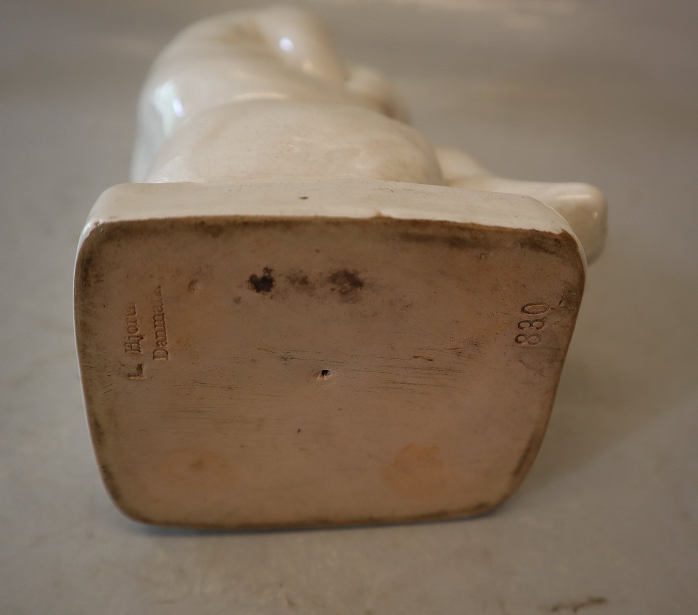 L. Hjorth Denmark Hvid Keramik 830 Sørgende Kvinde 18 cm Designet af Gertrud Kudialka Hvid figur med aldersrelaterede brugsspor og let krakkelering Bornholm