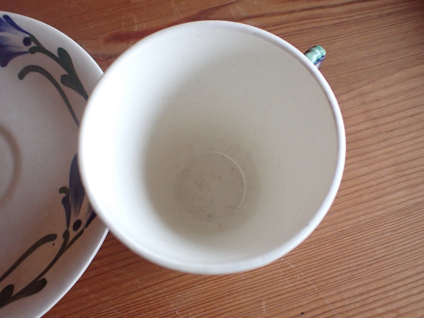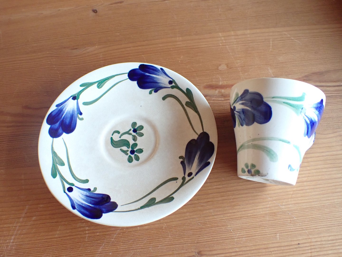 Text available in Danish: Aluminia Sværdlilie/Blå Cenerarier fajance kaffekop 187/182, lille kop med underkop. Designer: Harald Slott-Møller 1903. Mål: Kop foroven: 6,5 cm., højde: 6,2., diameter underkop:13,3 cm. I pæn stand i forhold til alde med lette kakkeleringer..