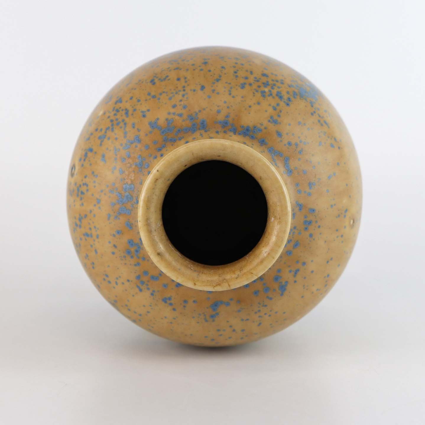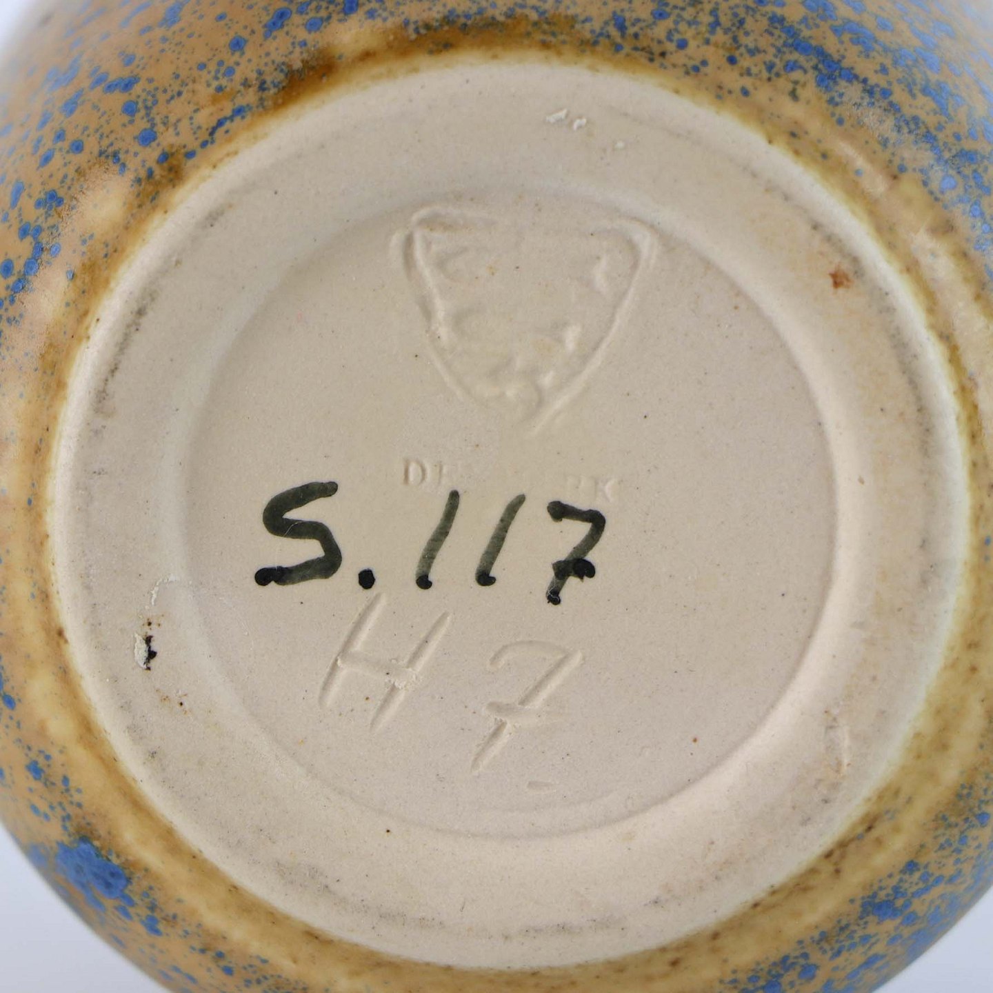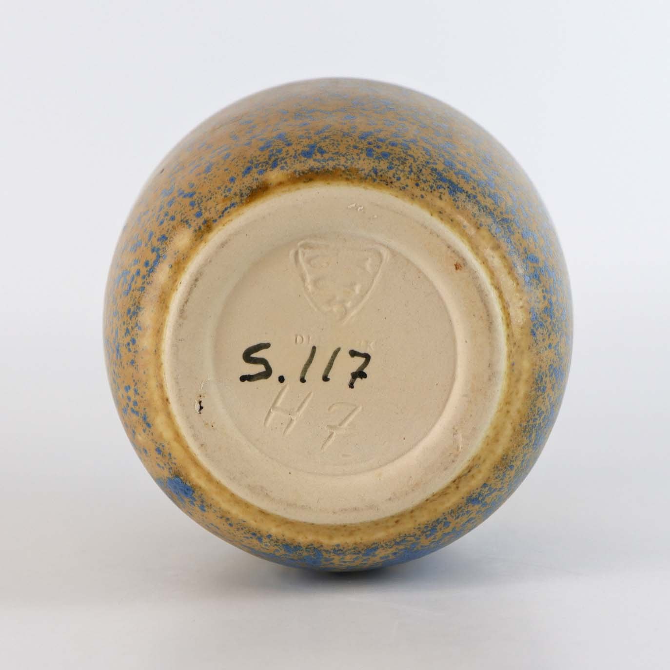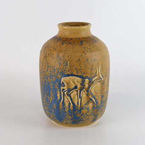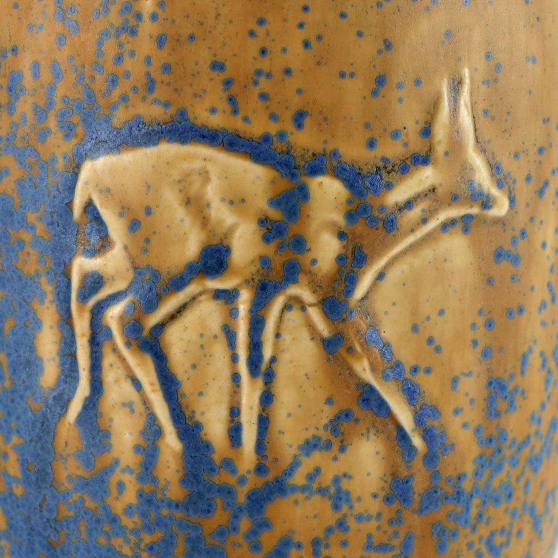 Vase i stentøj i gule og blå farver med motiv af et dådyr. Nr. 117 H7
