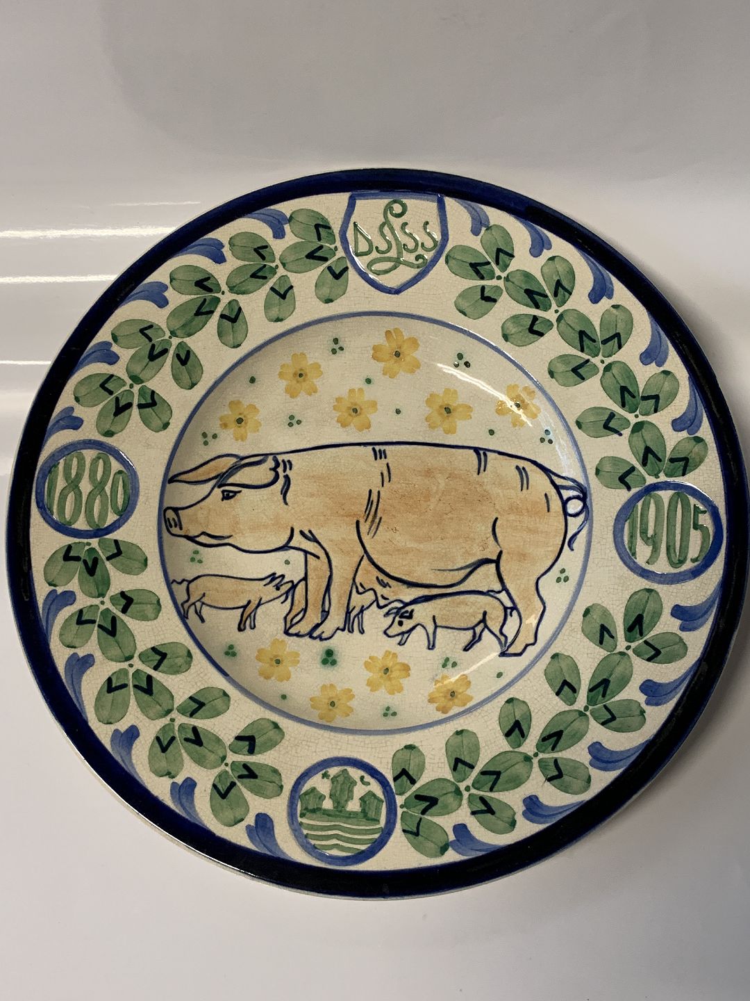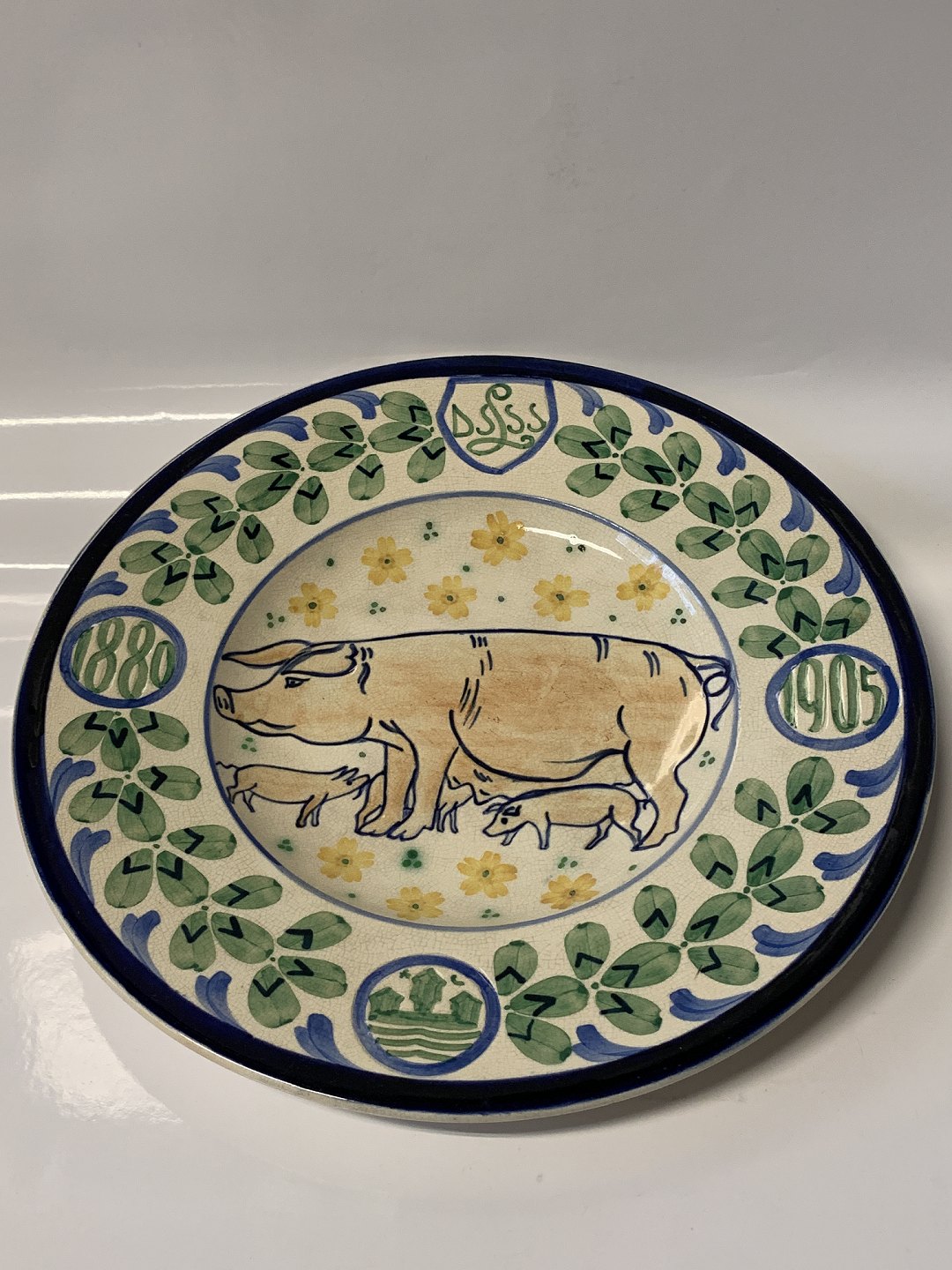 Aluminia Fajance Platte med Grise. Flot antik platte, lettere krakeleret der understreger den antikke identitet. Flotte farver og motiv.
