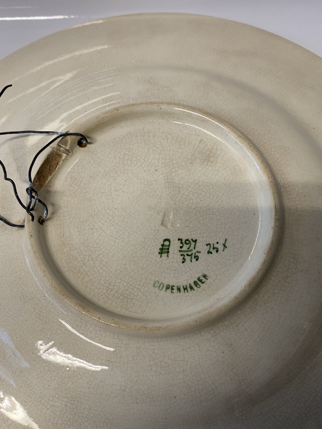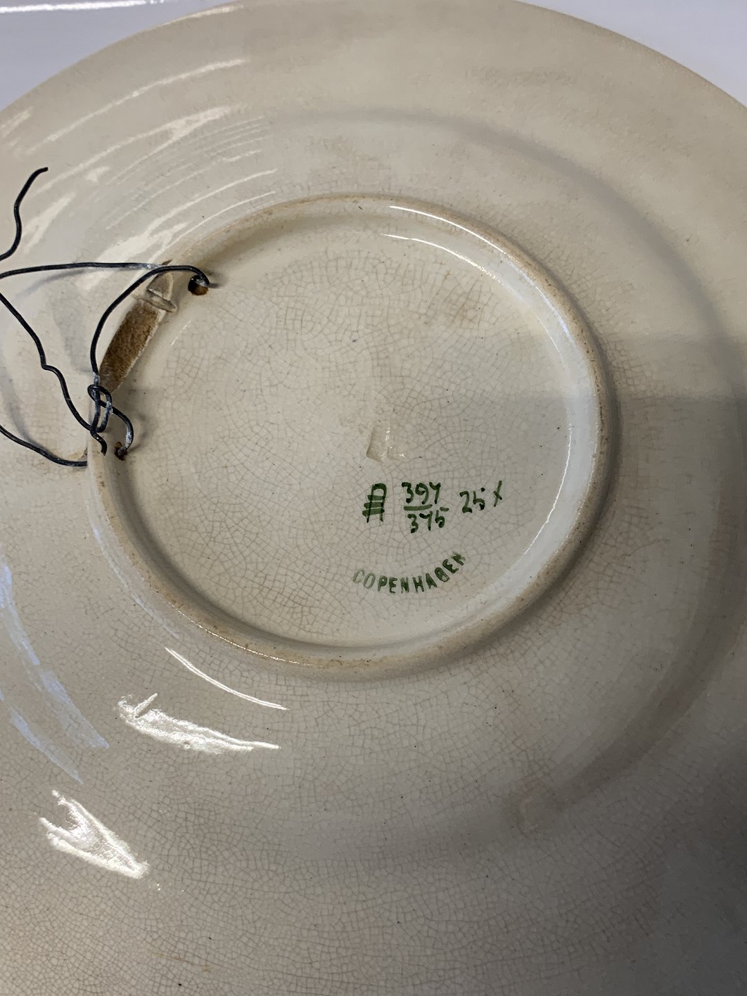 På bagsiden er mindre skade, der ikke ses når platten hænger eller står på bordet. Alt i alt en flot antik platte til samlingen.
