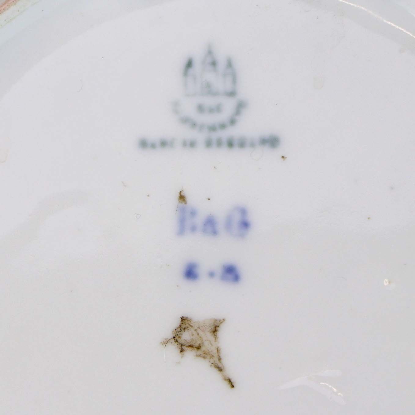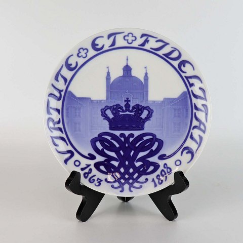 Platte i porcelæn fremstillet til minde om Kong Christian 9. med teksten Virtute et Fidelitate (med mod og trofasthed) år 1863-1898 og motiv af Amalienborg.
