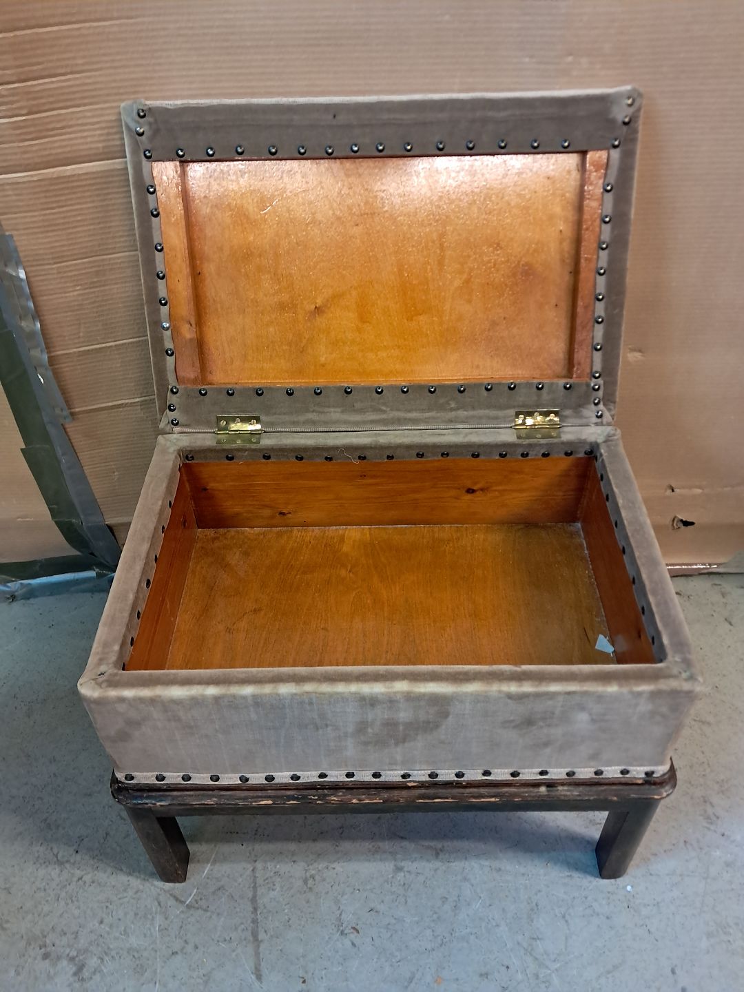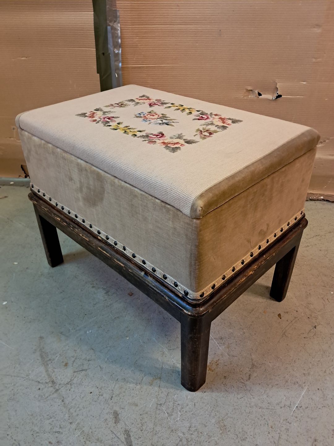 Puf i birketræ med broderet sæde, fra 1930erne.