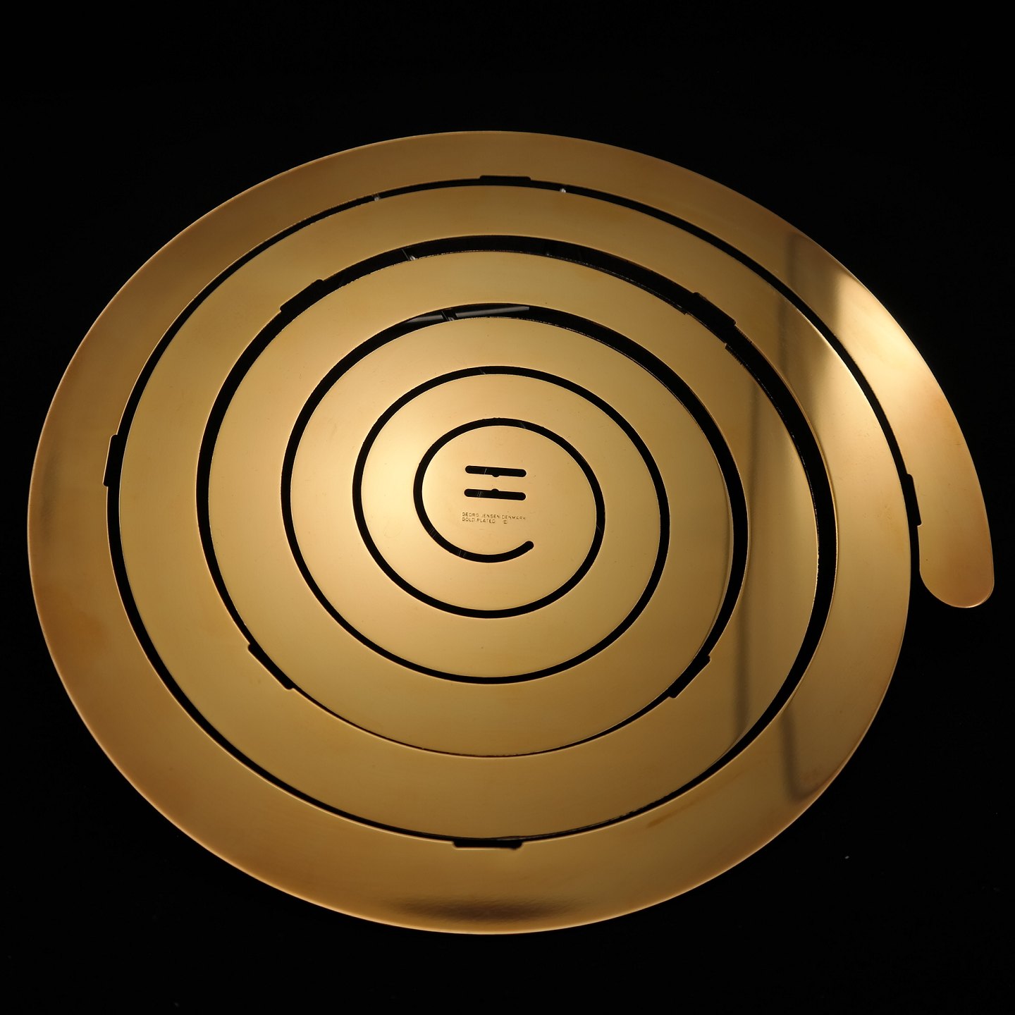 Julepynt i messing forgyldt med 24-karat guld fra Georg Jensen. Spiral ophæng til Juleuroer med rødt bånd i æske.