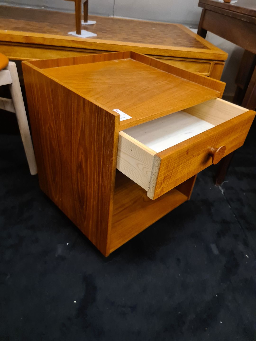 Dansk Design natbord fra 1970'erne med skuffe og på hjul. Fremstillet I teakfinér. Fremstår pænt og velholdt uden nævneværdige brugsspor.