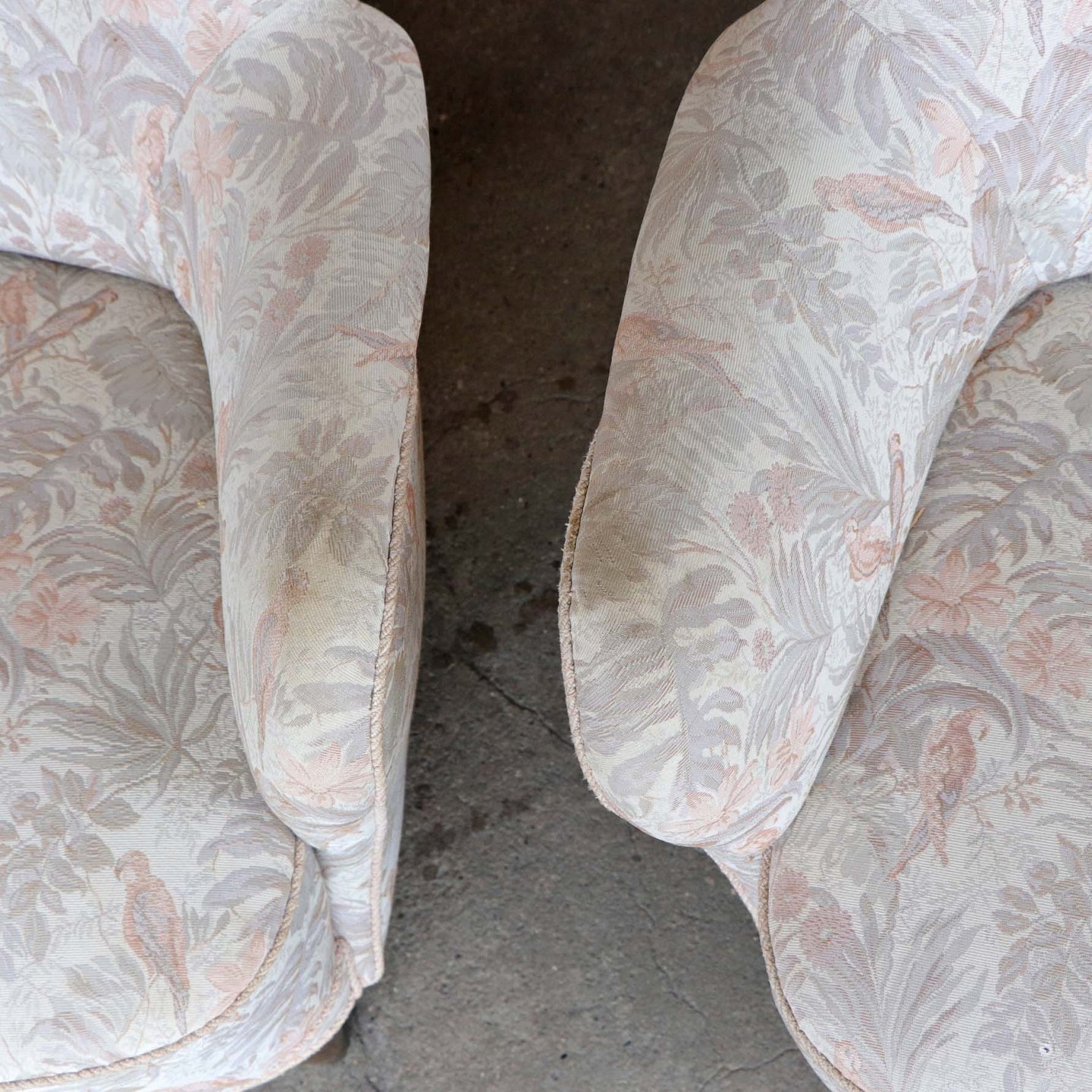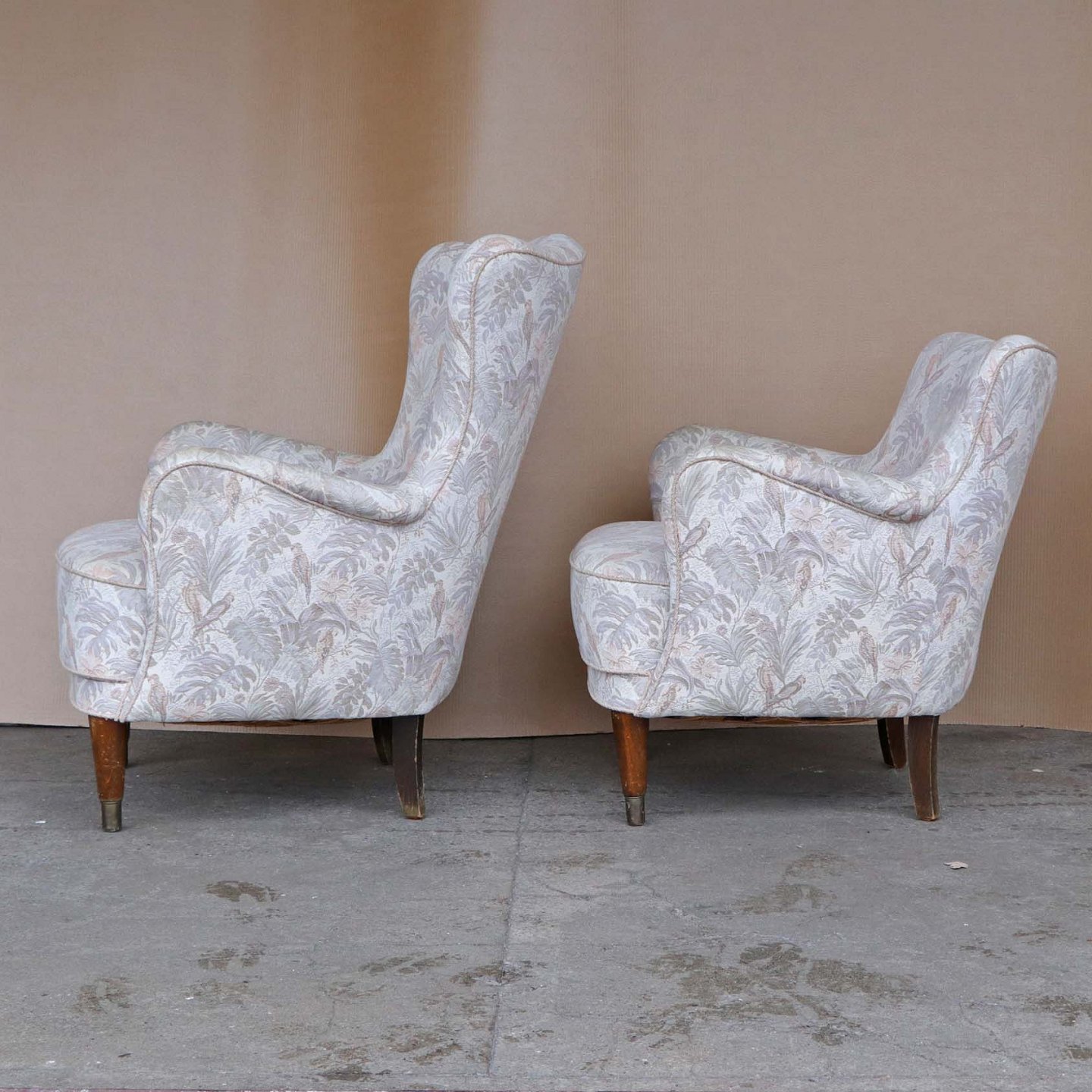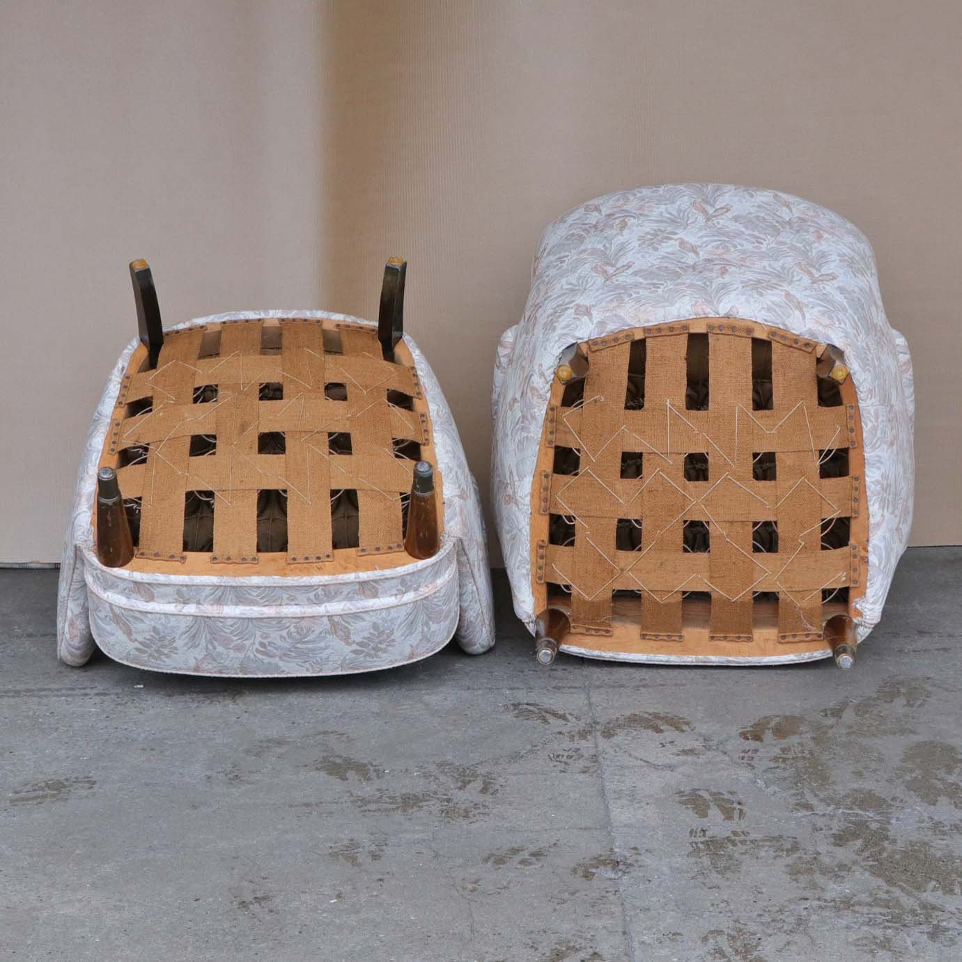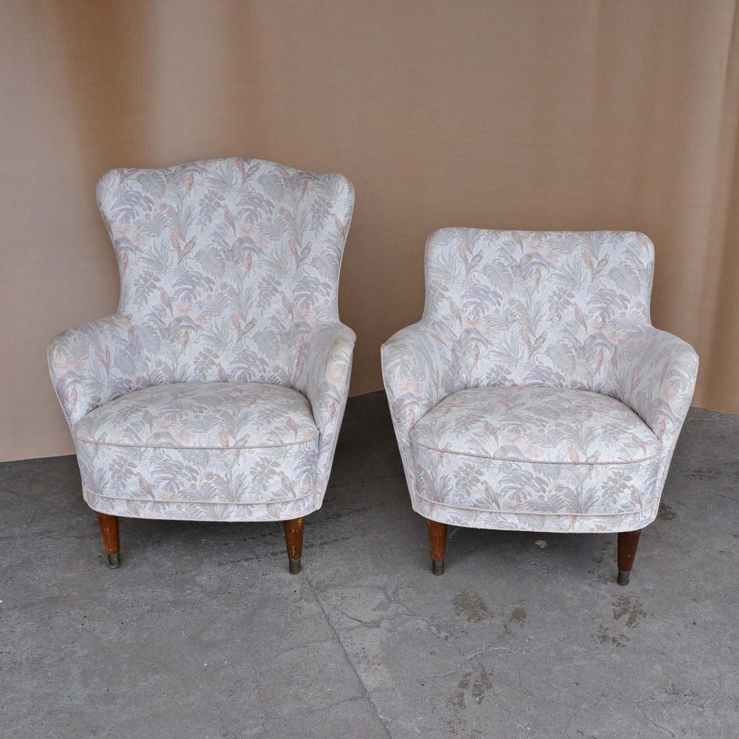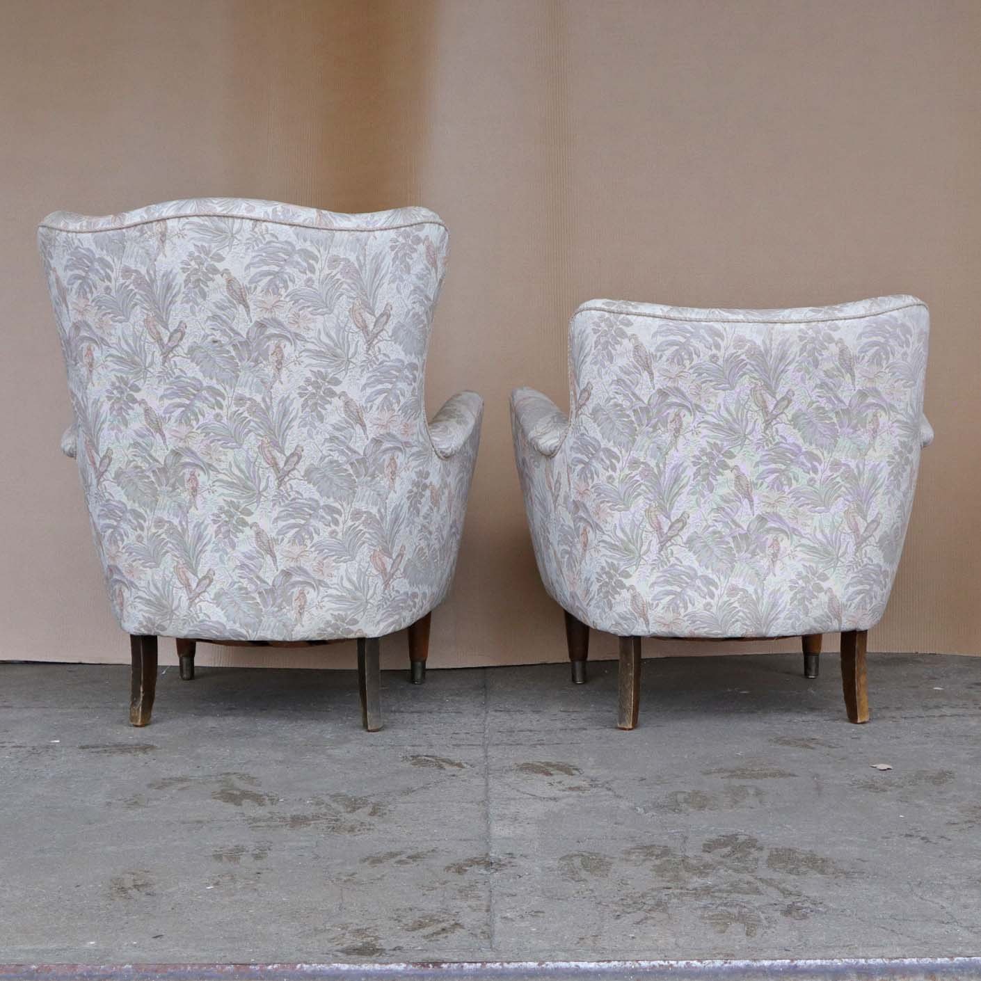 Et sæt med en lav lænestol og en højrygget lænestol. Stolene er med springfjeder sæder og betrukket med lyst mønstret stof. Stellet er af mørk lakeret træ. Også kaldet en herre og damestol
