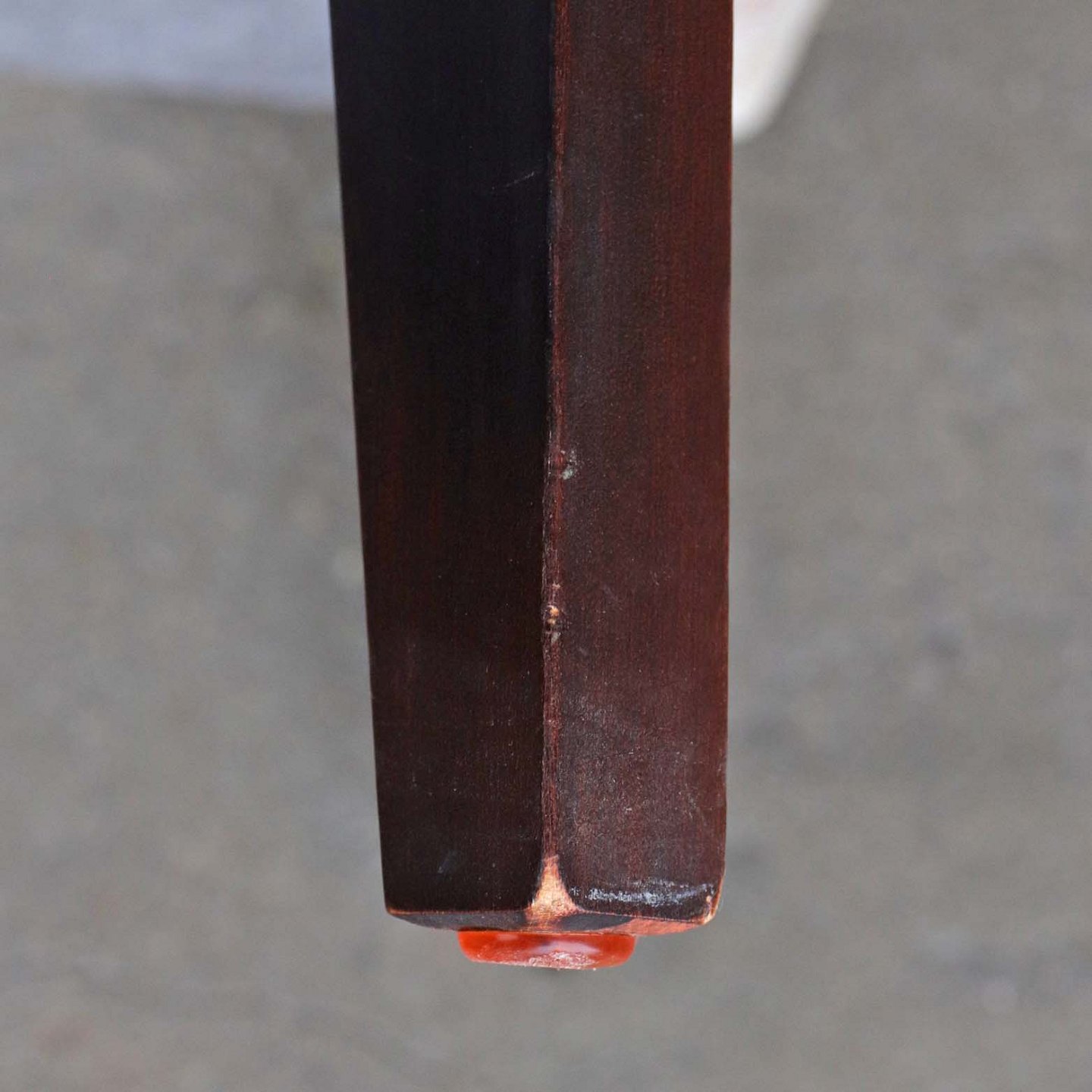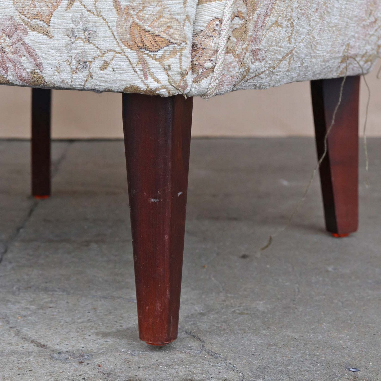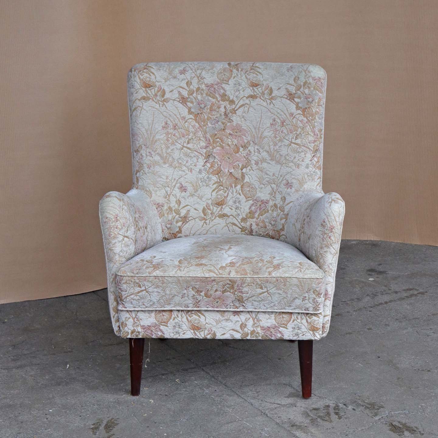 Text available in Danish: Ældre lænestol med springfjeder sæde betrukket med lyst mønstret stof. Stolen har firkantet tilspidset ben i mørk lakeret træ