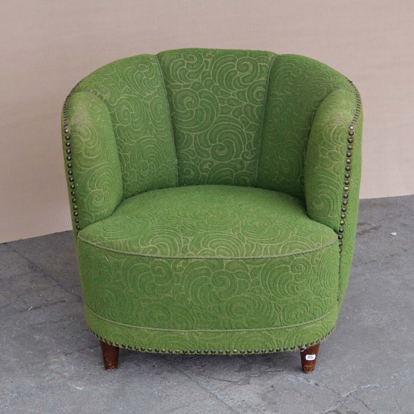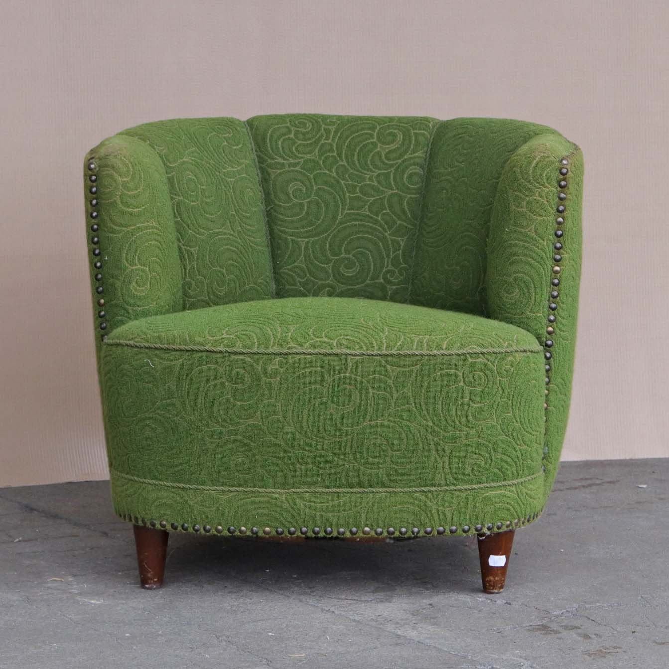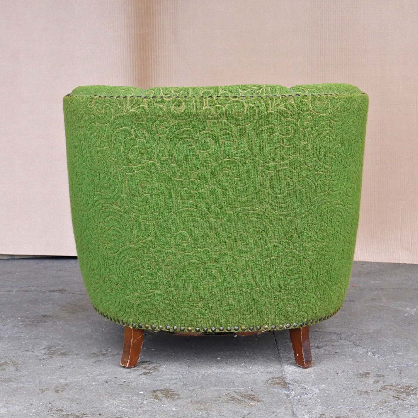 Ældre lænestol fra 1930-40'erne med rund form, springfjeder sæde og ben i mørk lakeret træ. Stolen er betrukket med struktureret grønt stof og prydet med nitter i metal.