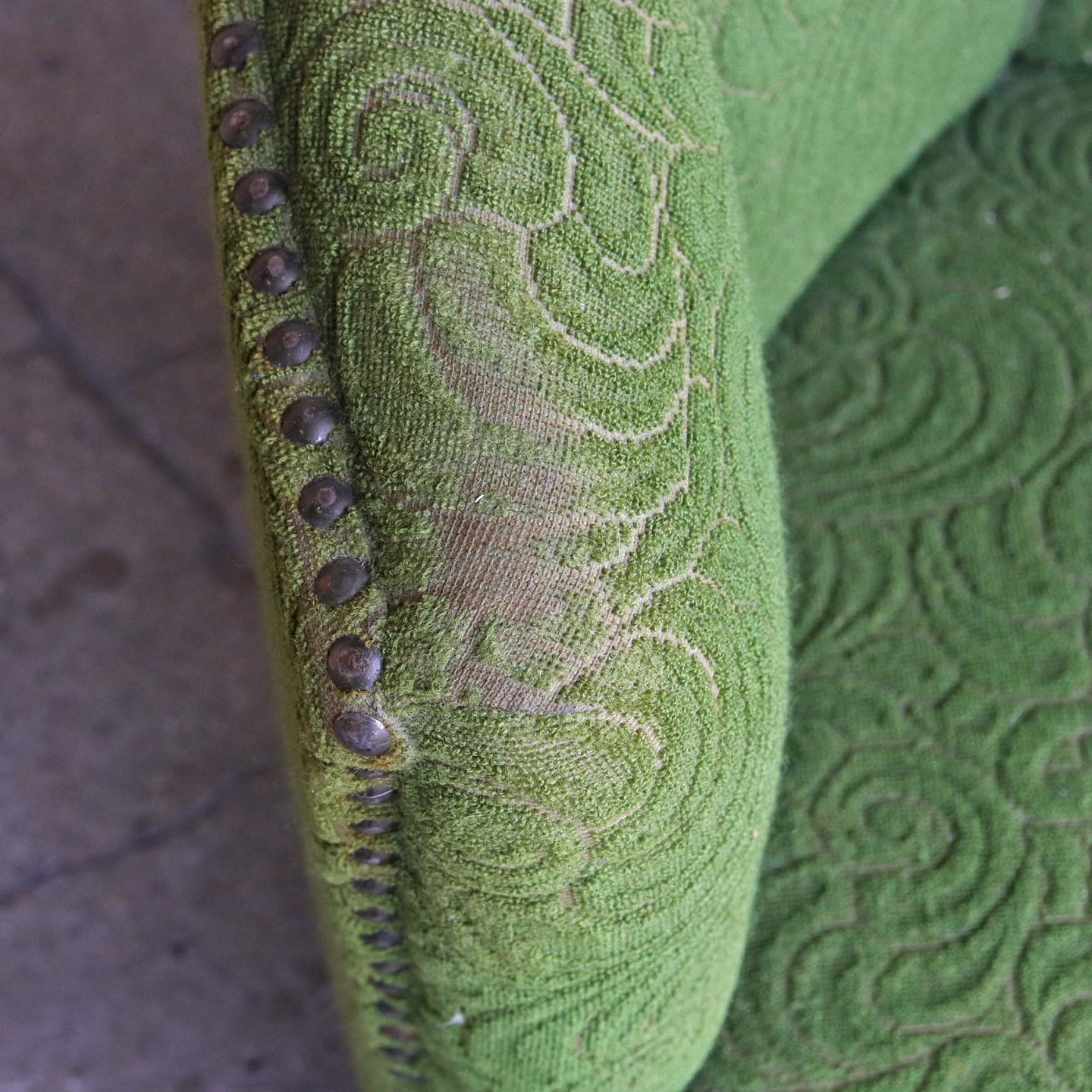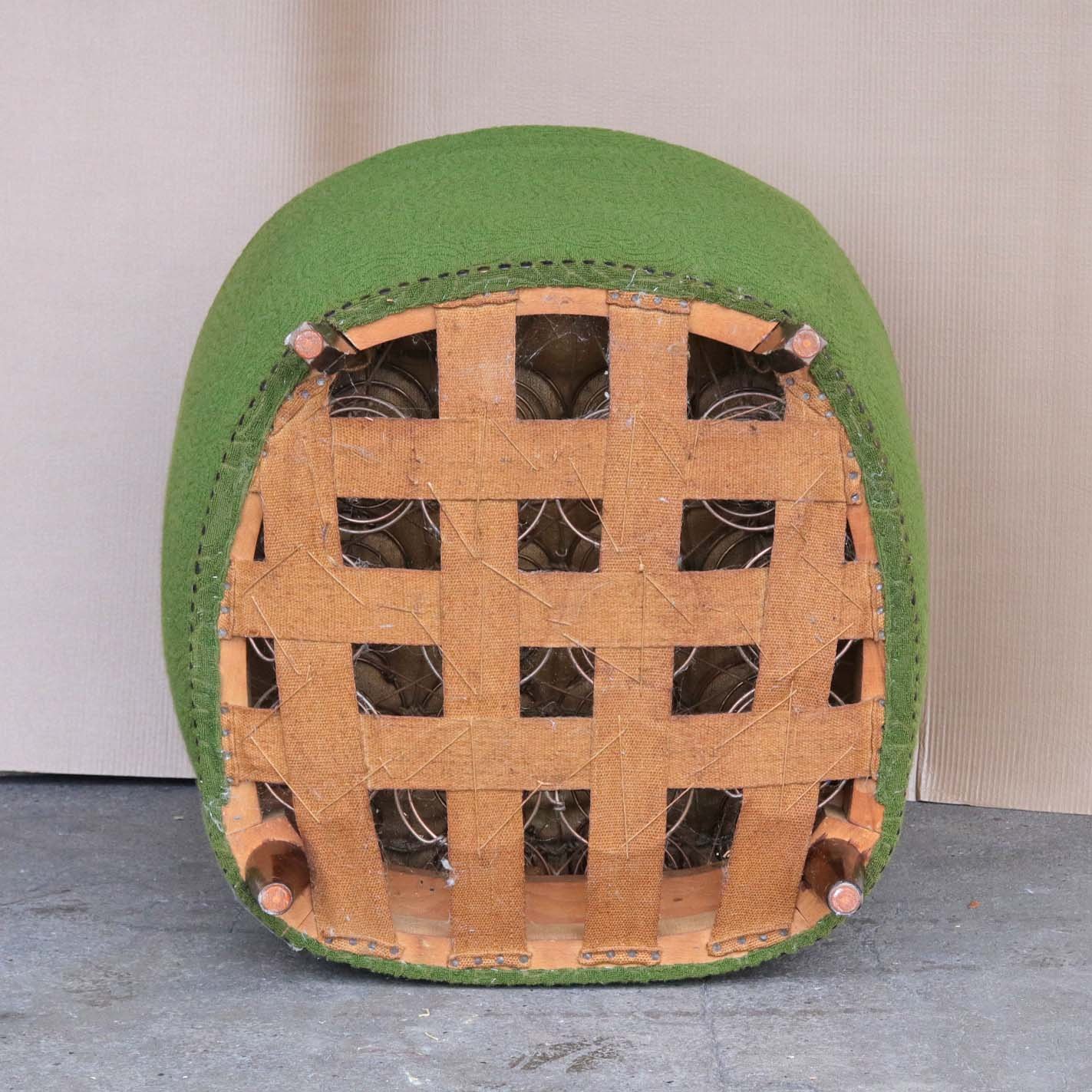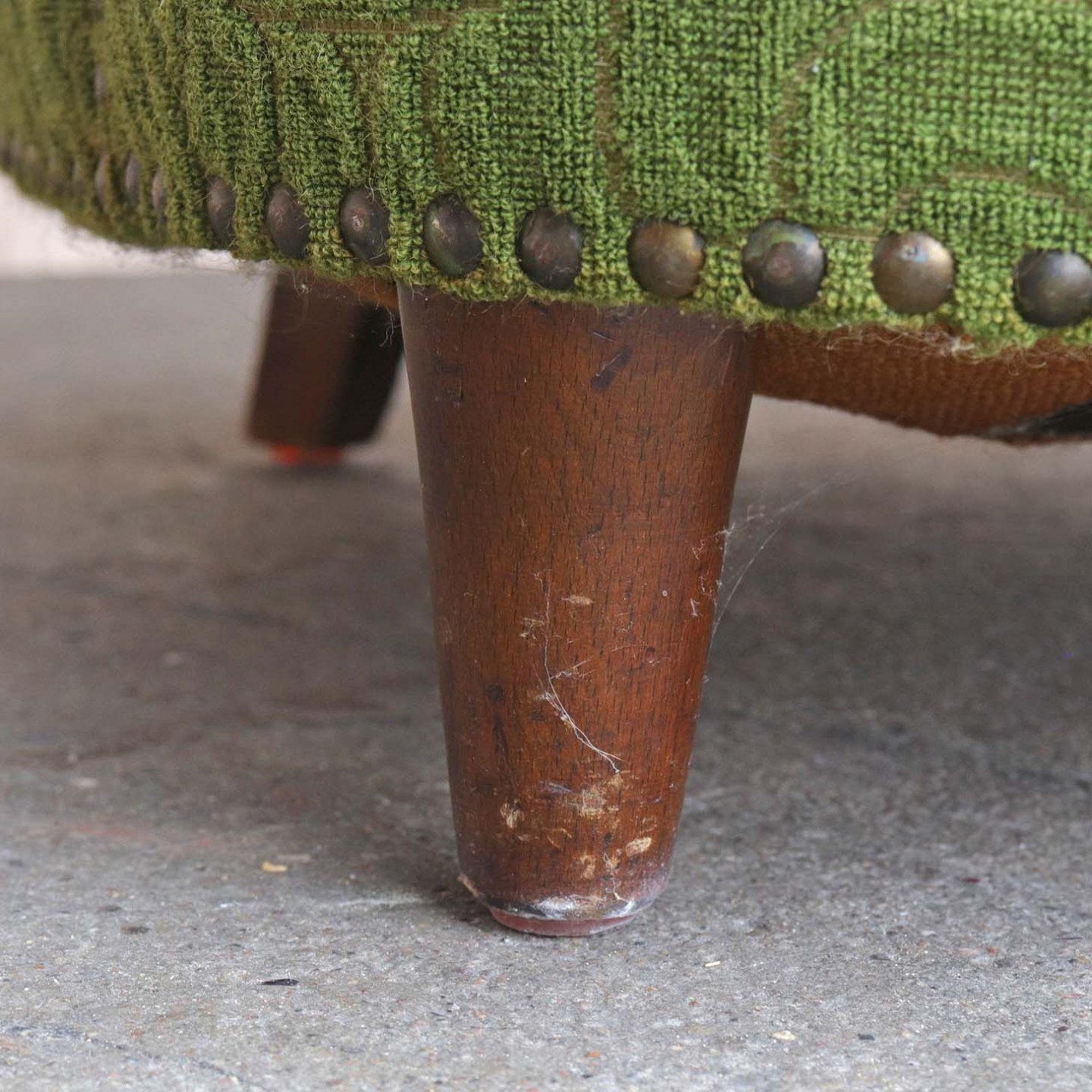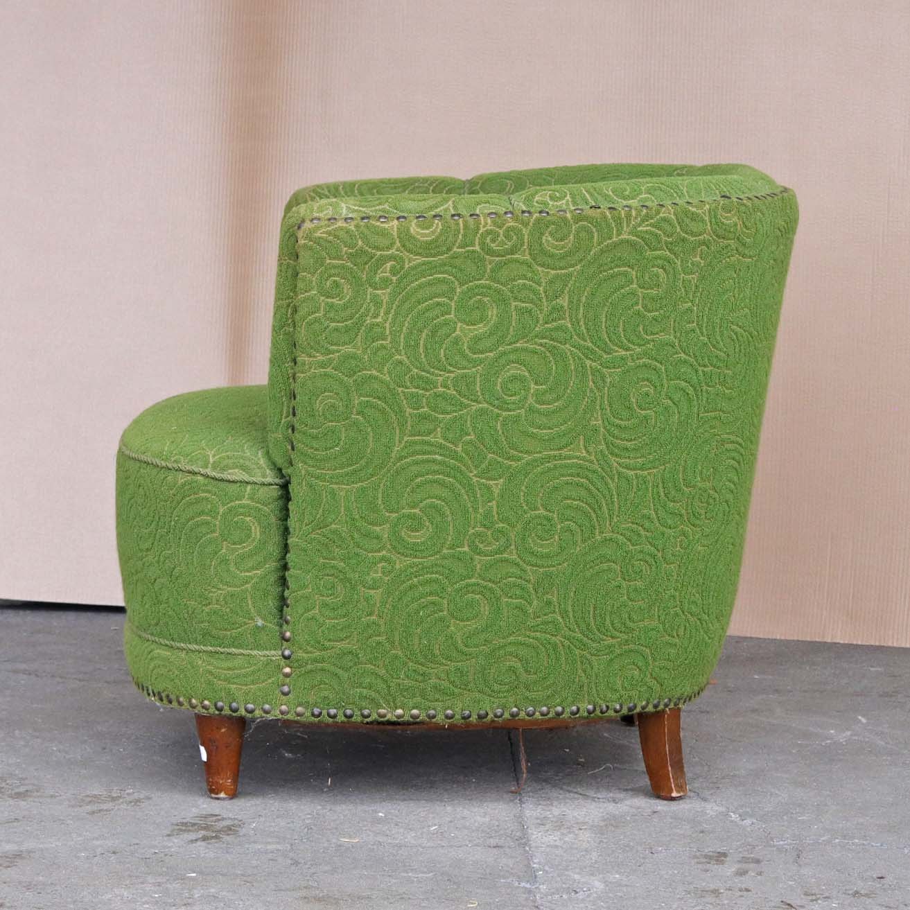 Ældre lænestol fra 1930-40'erne med rund form, springfjeder sæde og ben i mørk lakeret træ. Stolen er betrukket med struktureret grønt stof og prydet med nitter i metal.