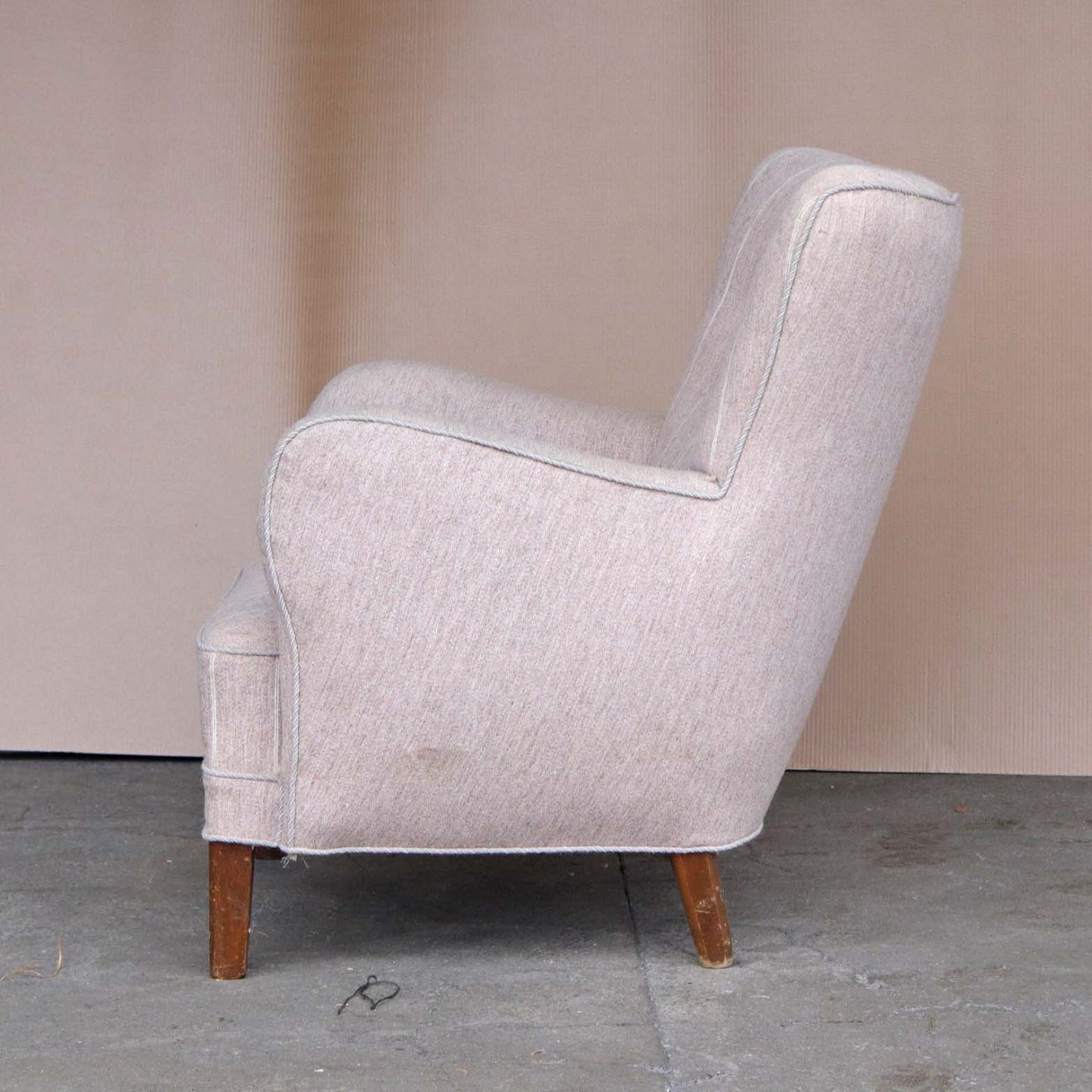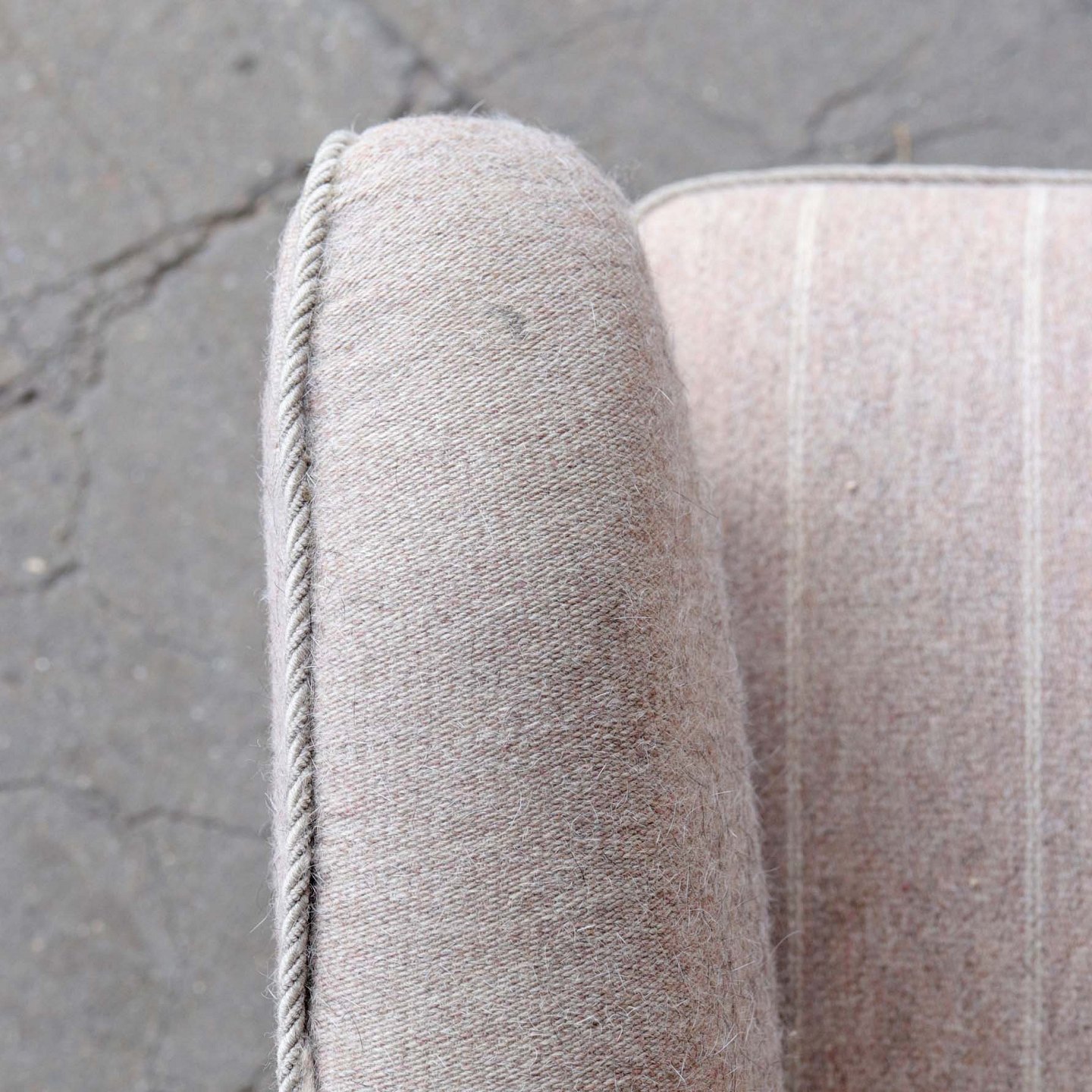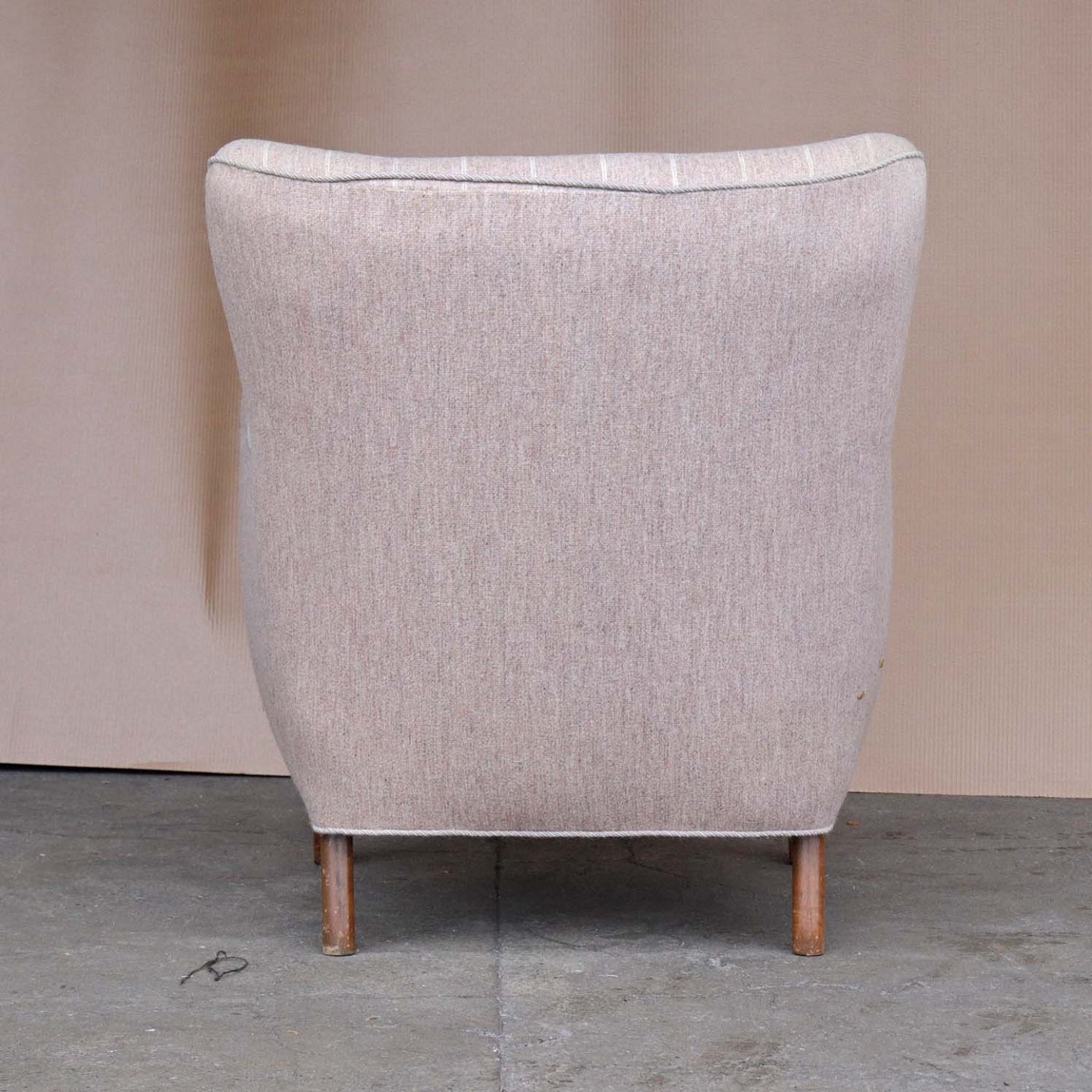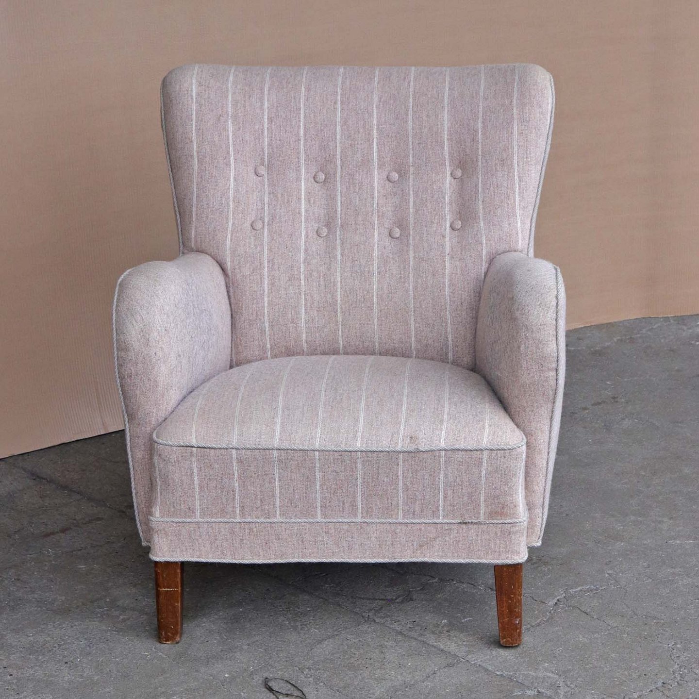 Text available in Danish: Ældre polstret lænestol med stel i lakeret træ. Stolen er betrukket med stribet hvid og beigefarvet uldstof og har sæde med springfjeder