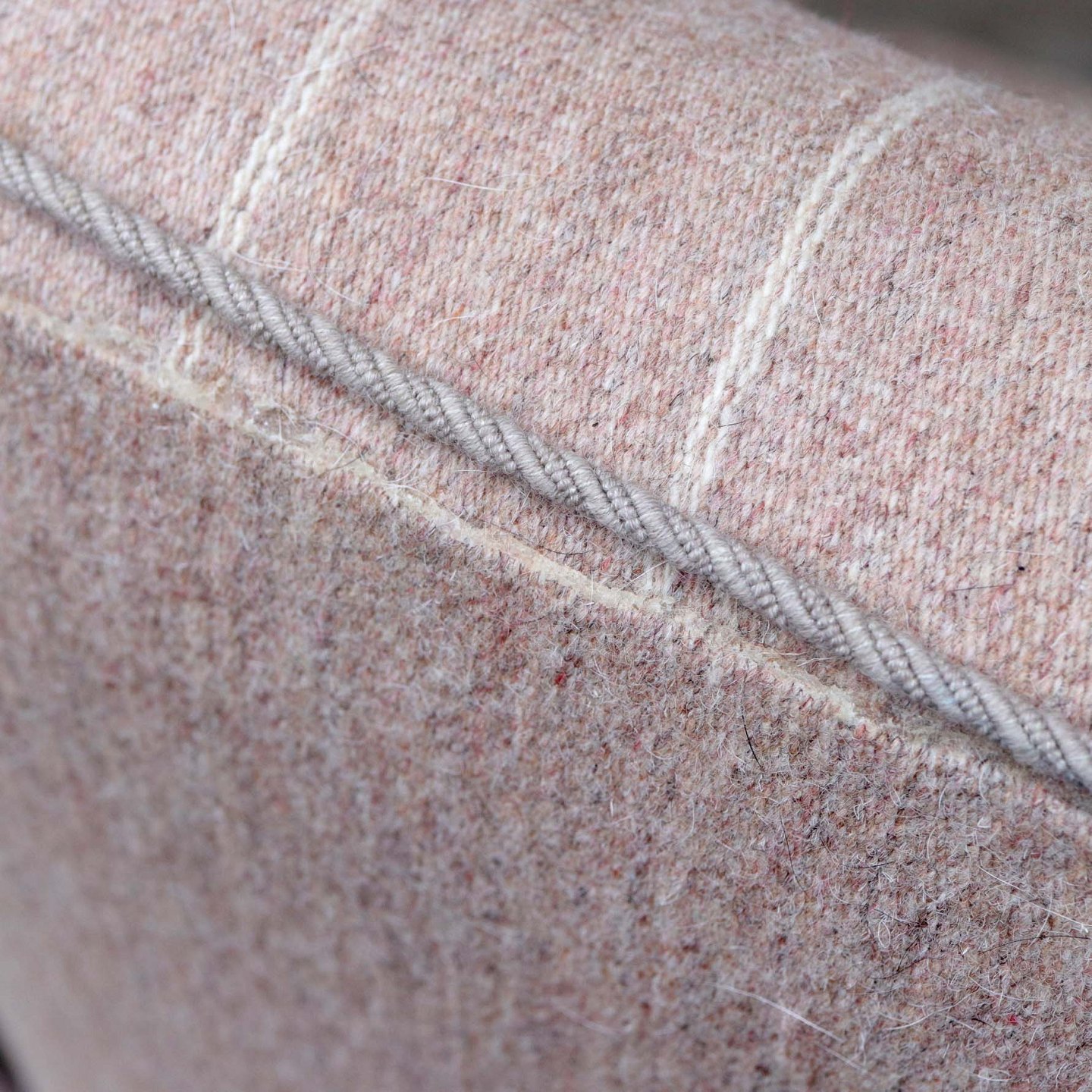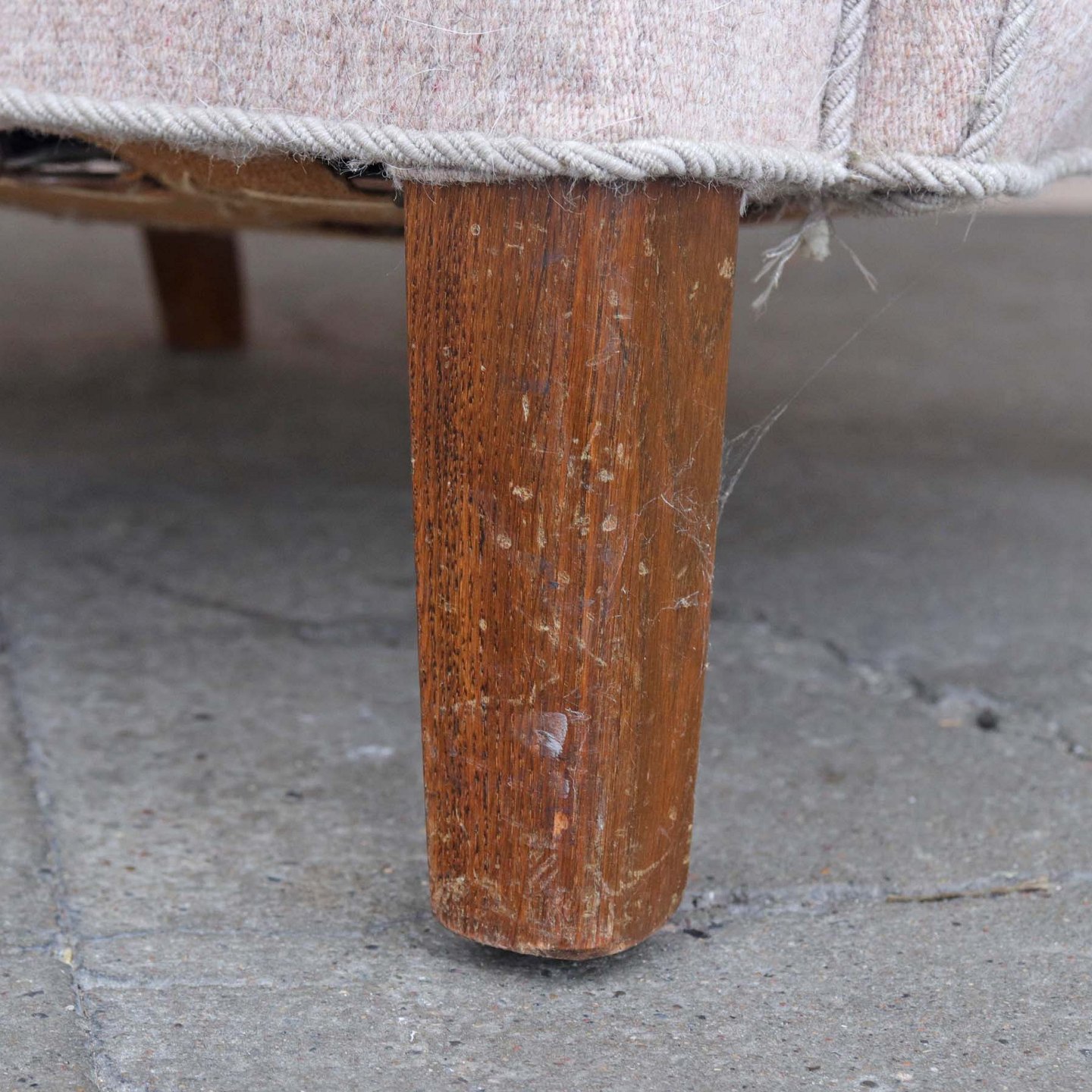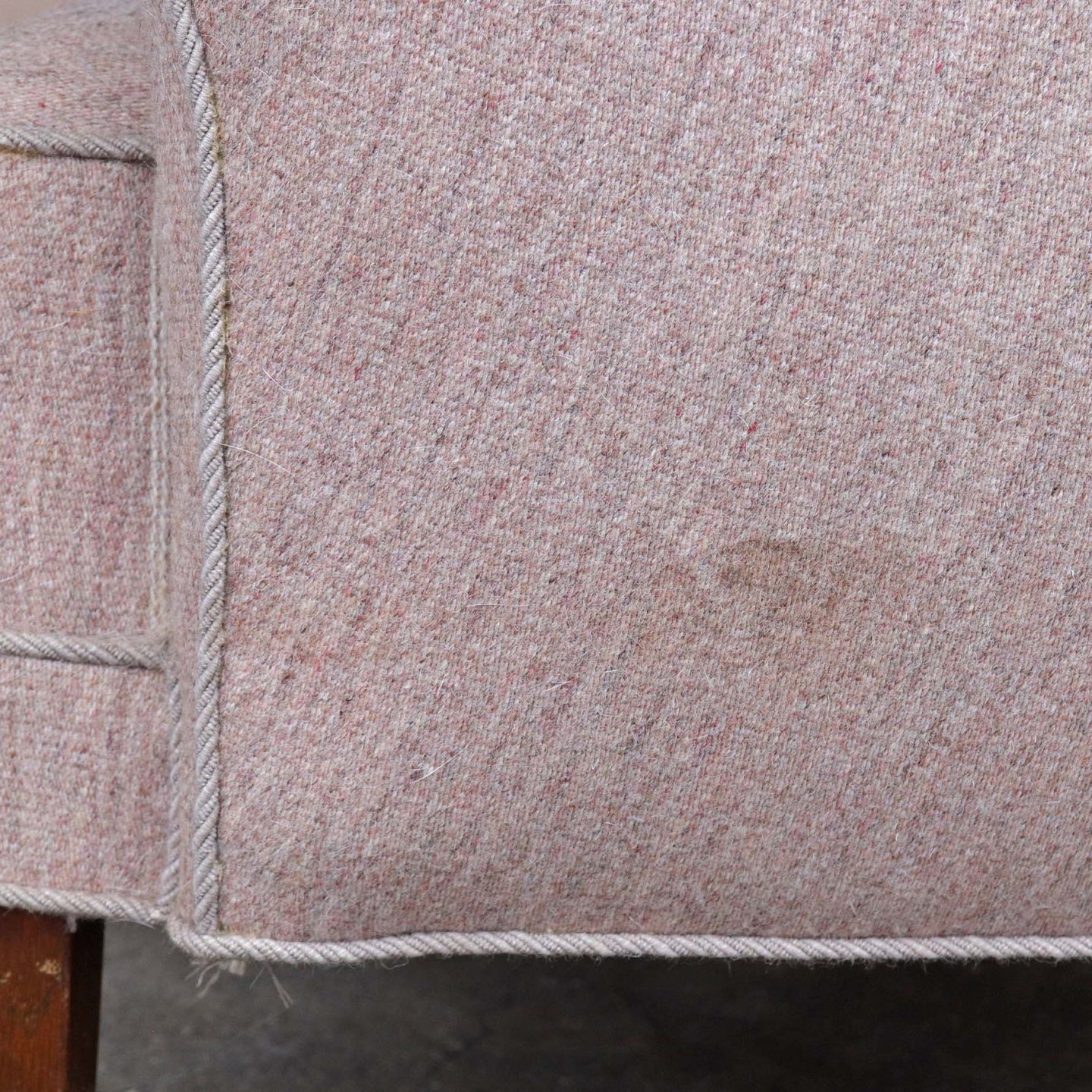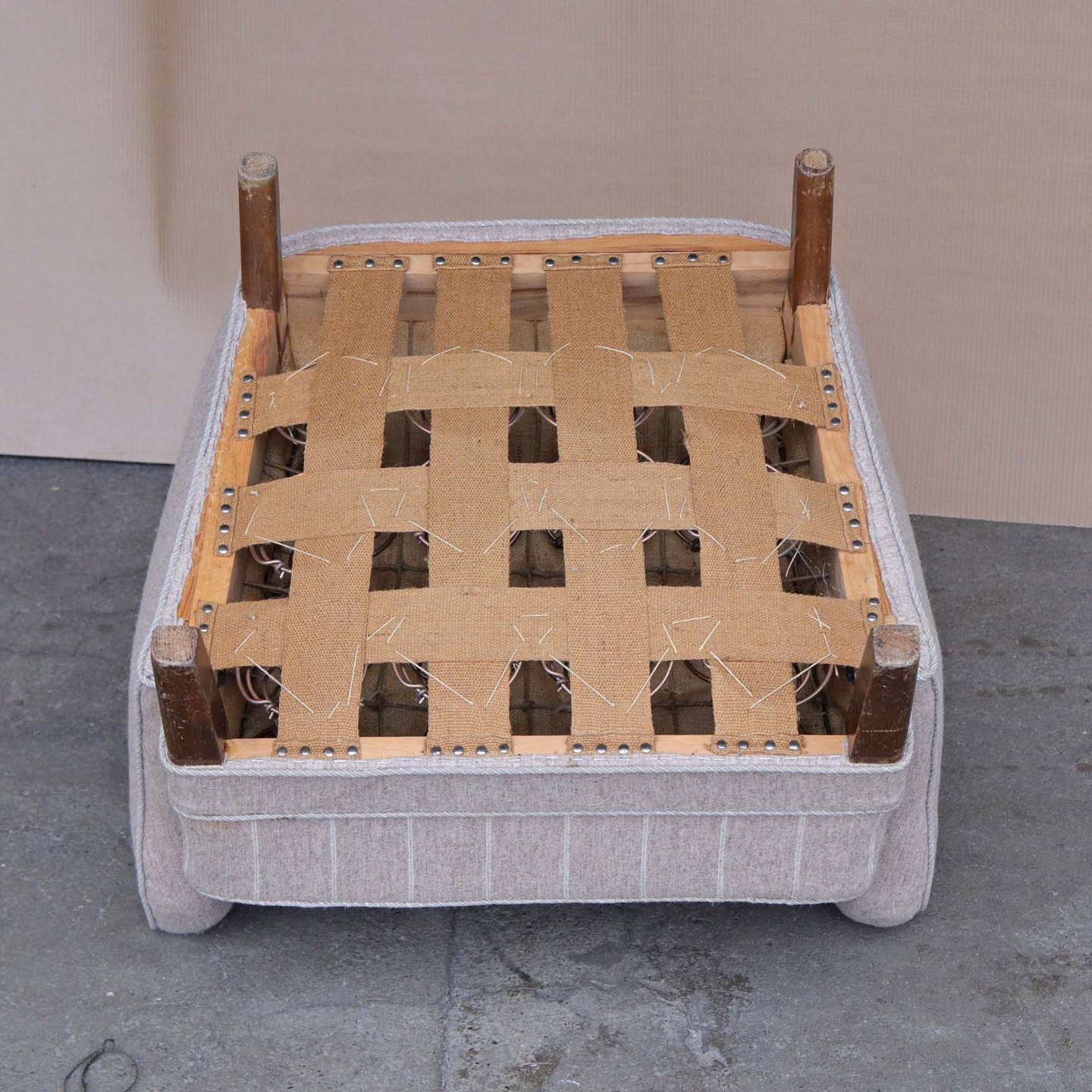 Text available in Danish: Ældre polstret lænestol med stel i lakeret træ. Stolen er betrukket med stribet hvid og beigefarvet uldstof og har sæde med springfjeder