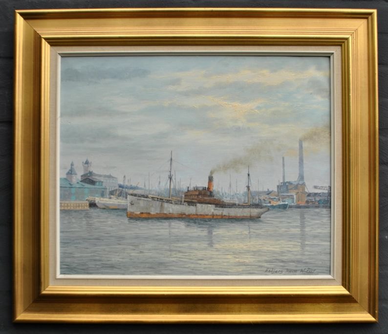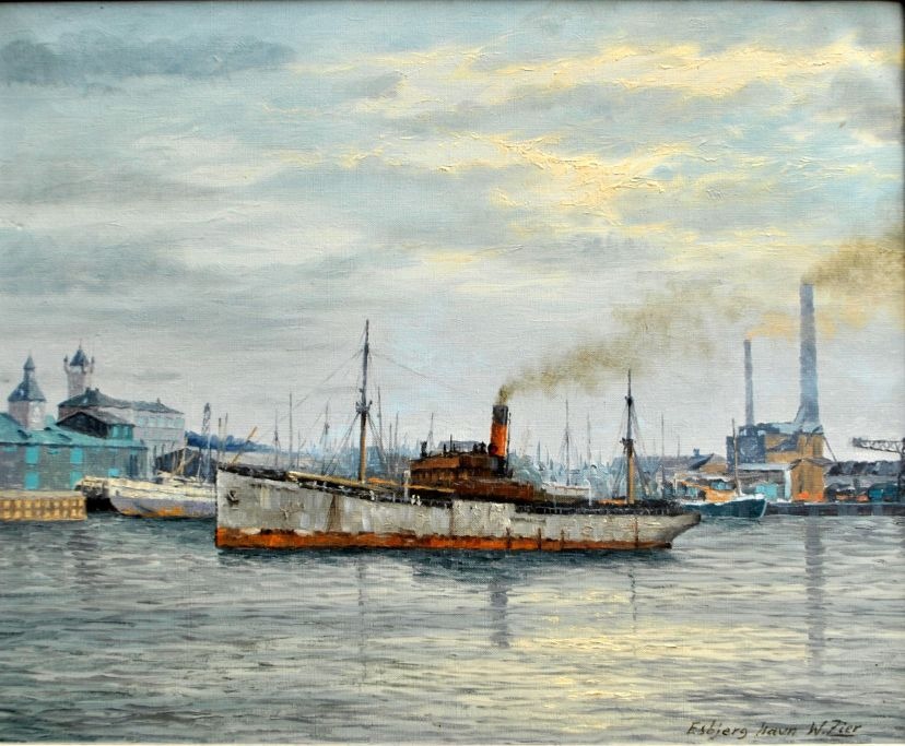 Zier, Wolmer (1910 - 1990) Danmark: Havnen i Esbjerg. Olie på lærred. Signeret. 45 x 55 cm.