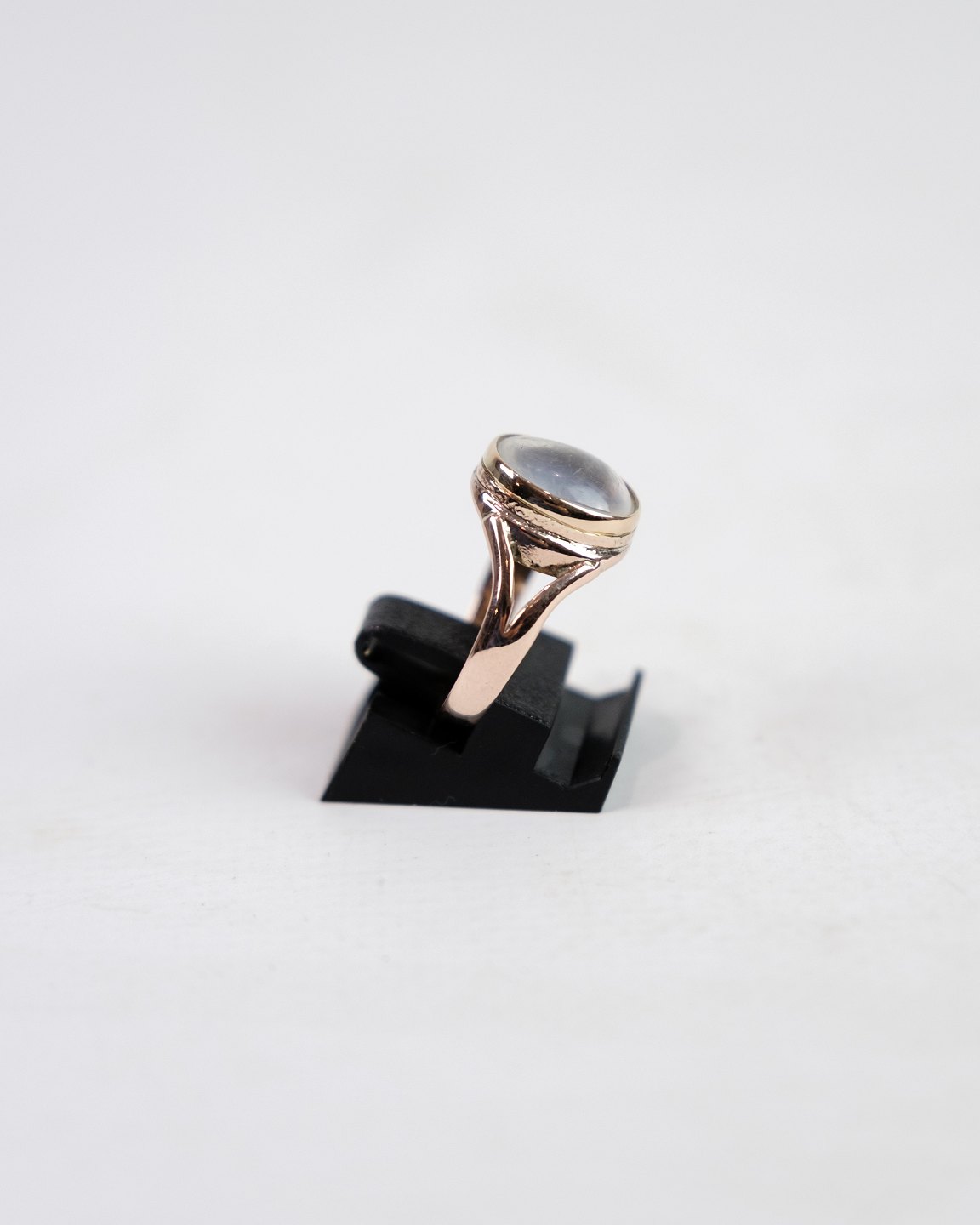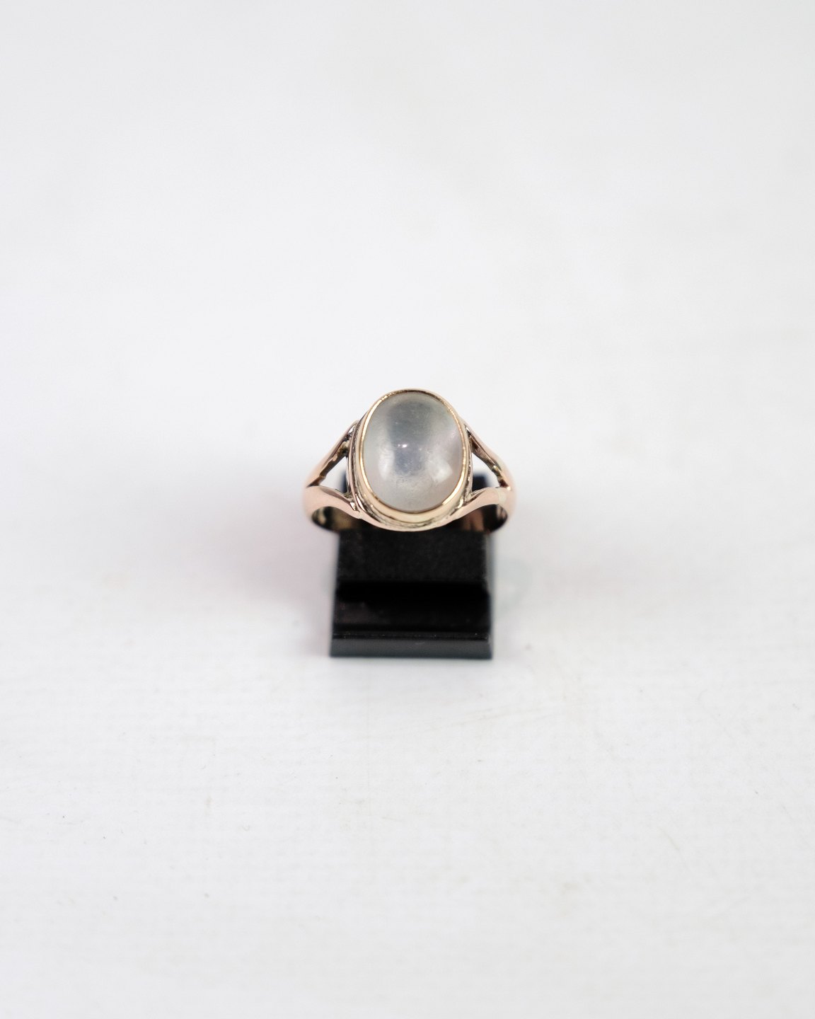 Guldring udsmykket med en stor flot oval månesten. Ringen er i 14 karat og er stemplet 585 og signatur B.S.