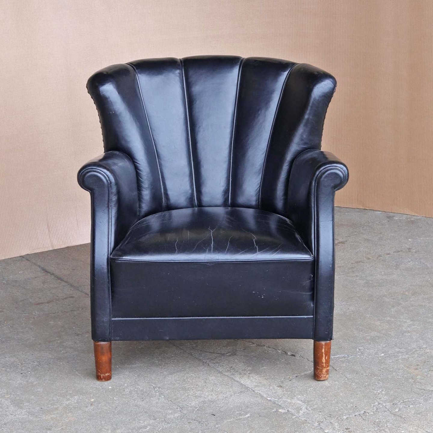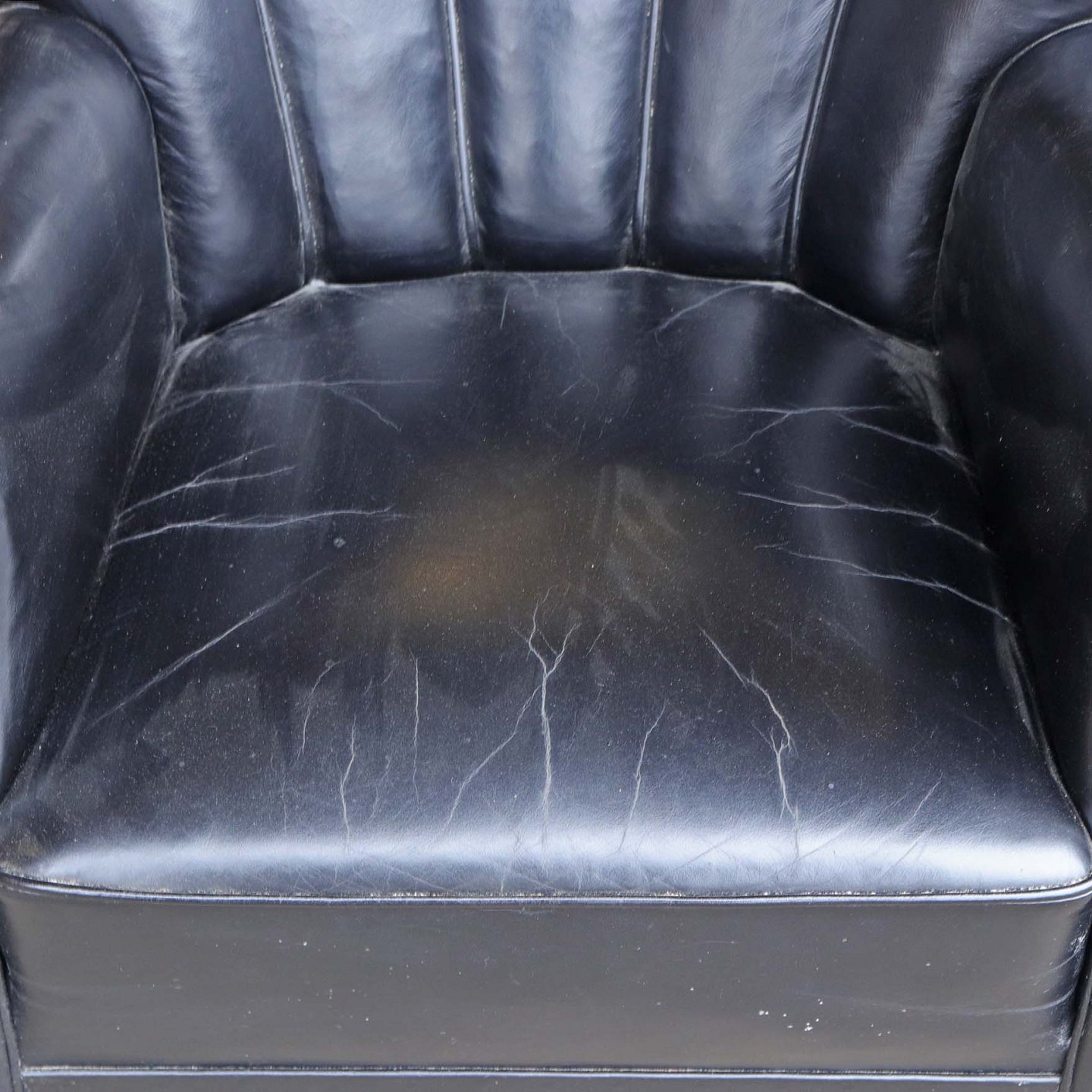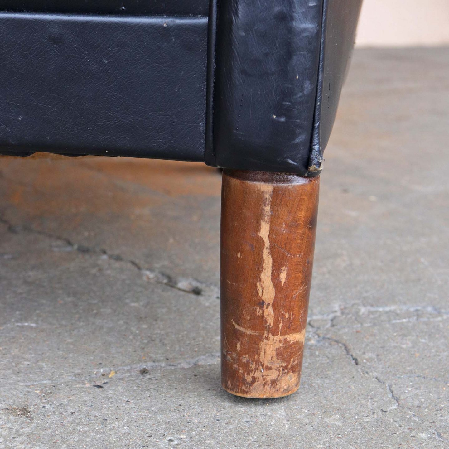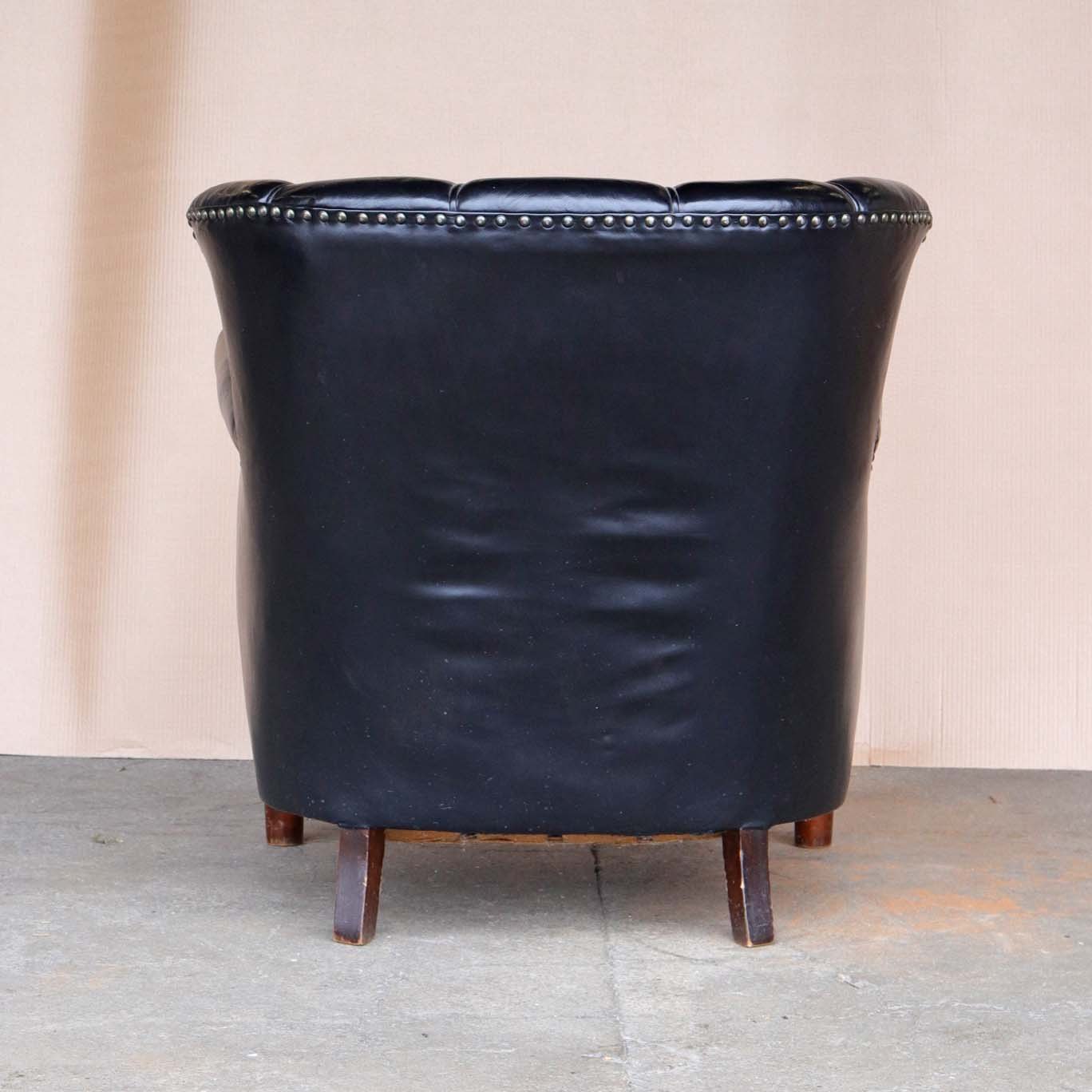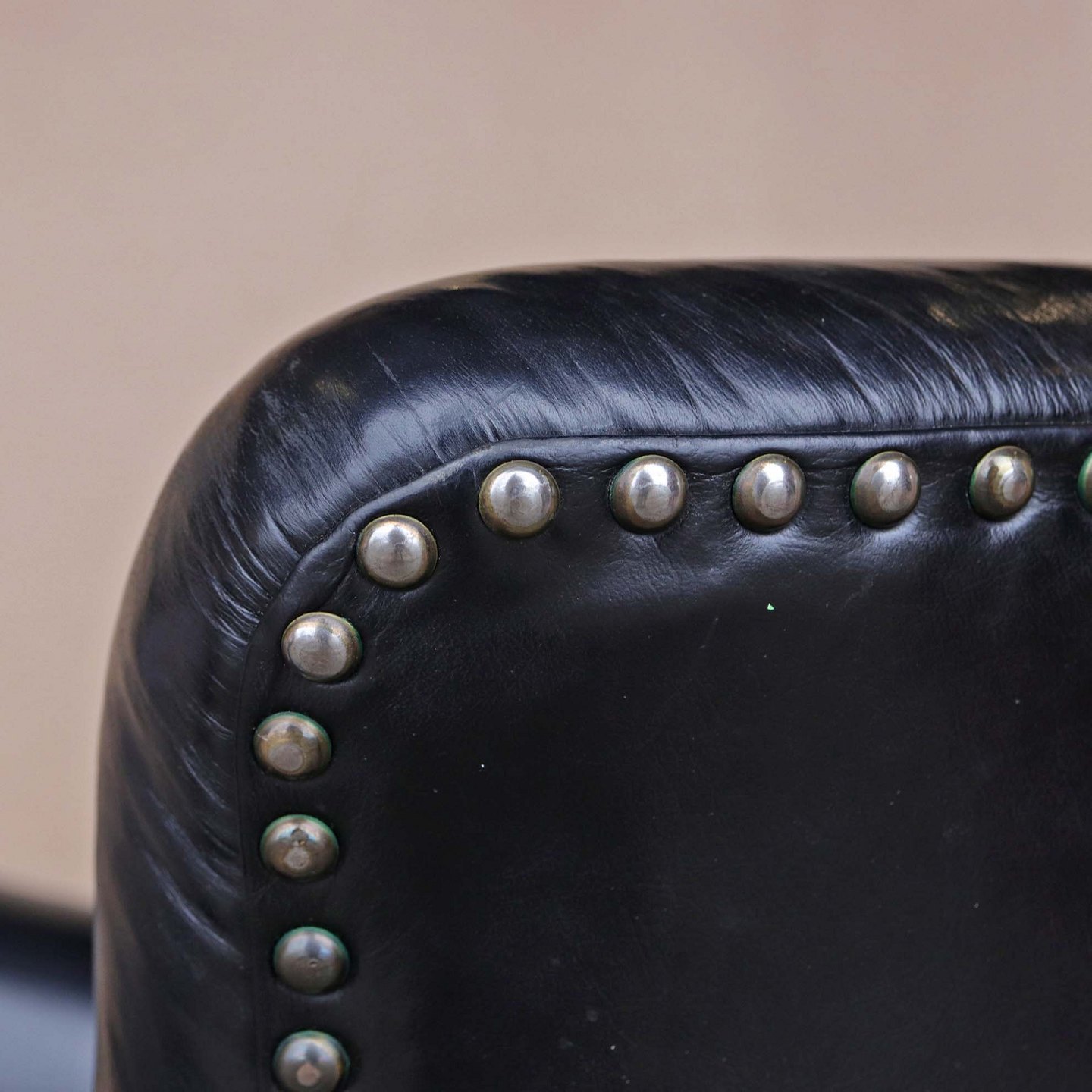 Ældre polstret med springfjeder sæde og stel i mørk lakeret træ. Stolen betrukket med sort læder prydet med metalnitter