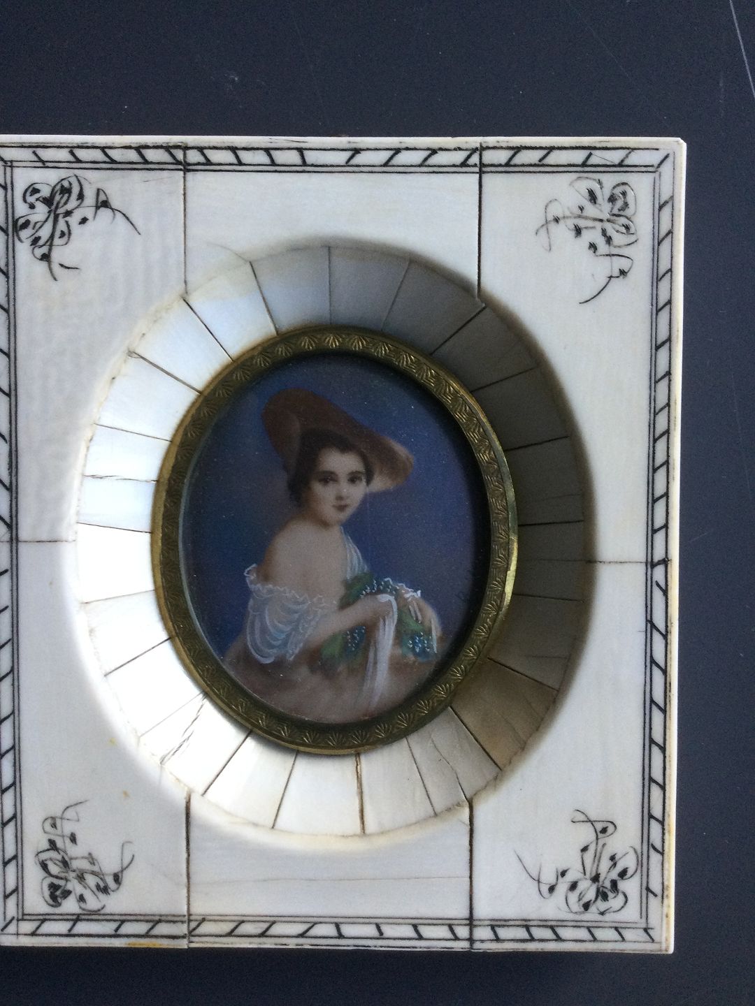 Miniature portræt i benramme - Portræt af smuk ung kvinde med hat og frugtkurv.