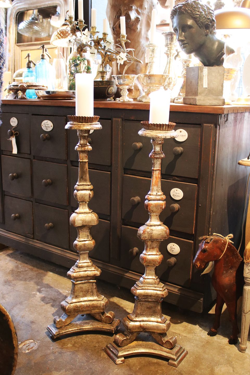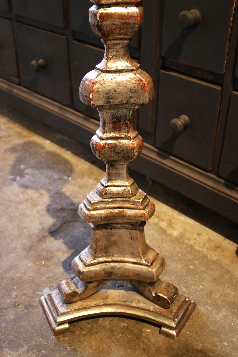 Antik , fransk gulv lysestage i udskåret træ med gammel sølvbelægning og en rigtig fin patina.