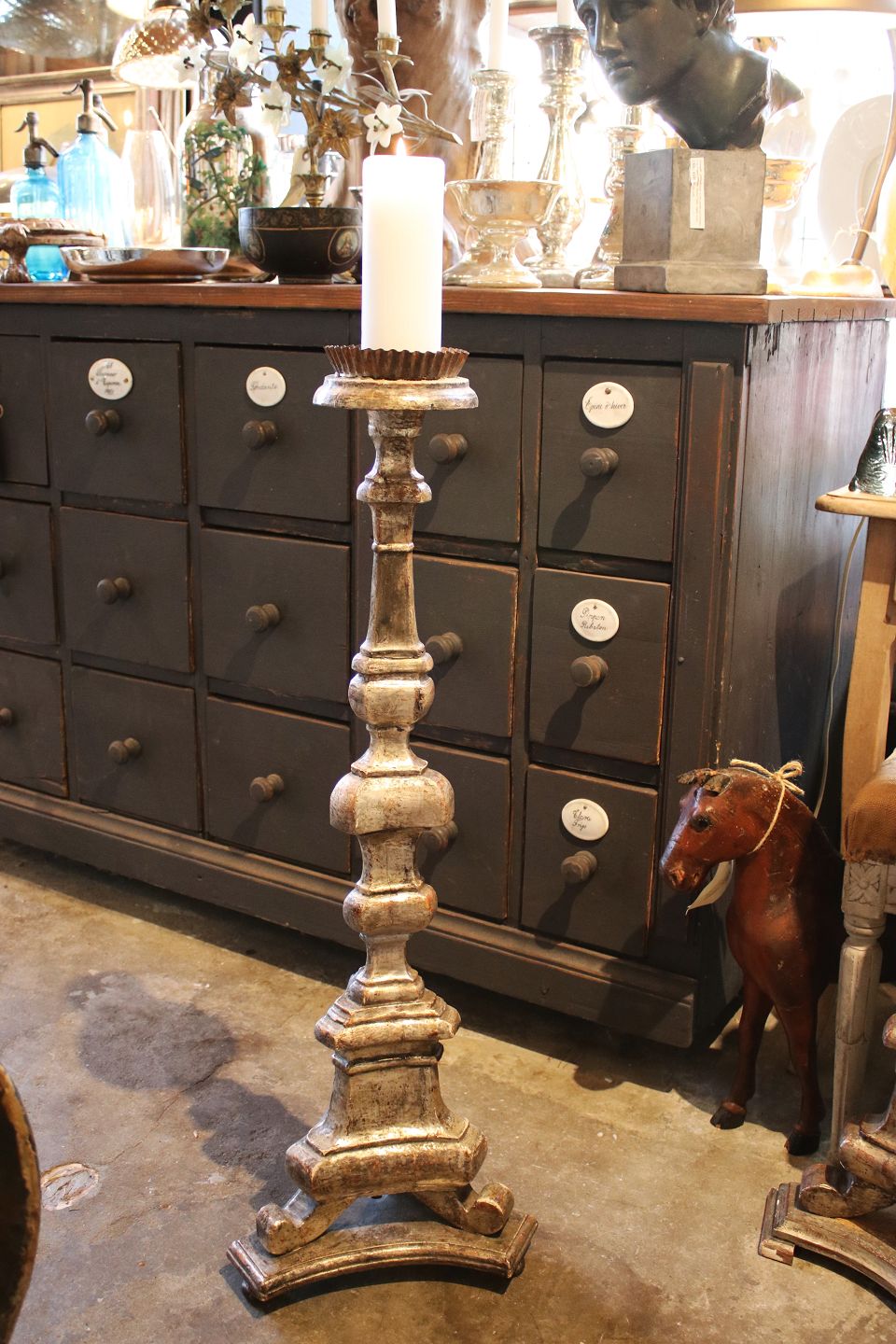 Antique, French floor candlestick in carved wood with old silver plating and a really nice patina.
