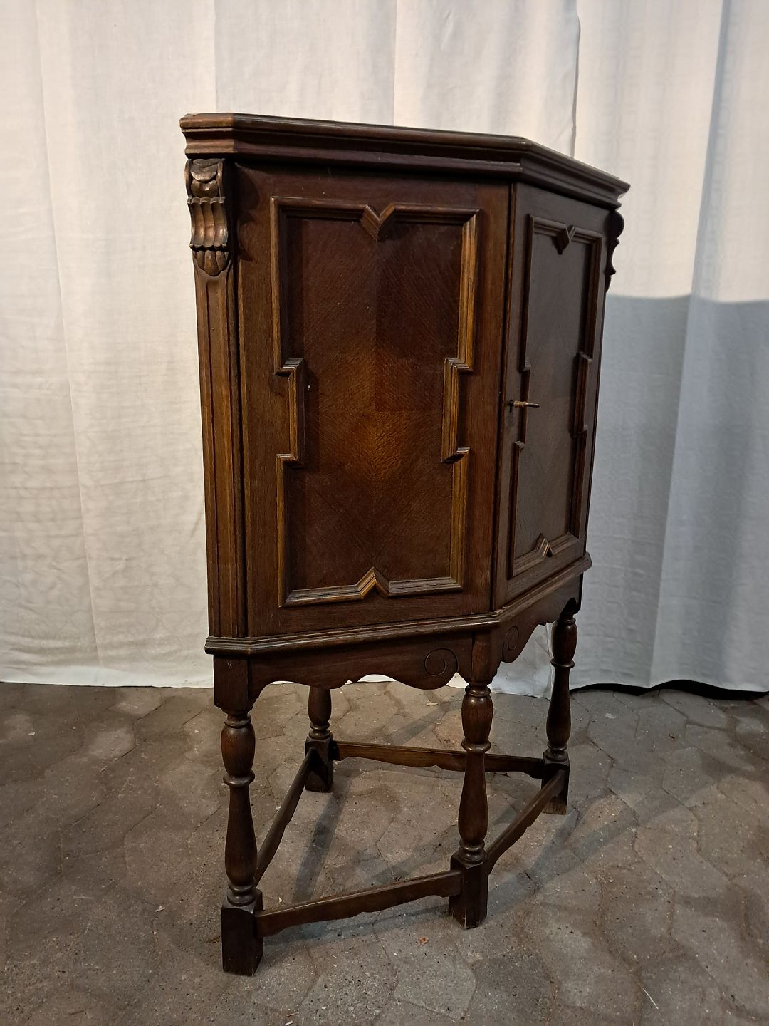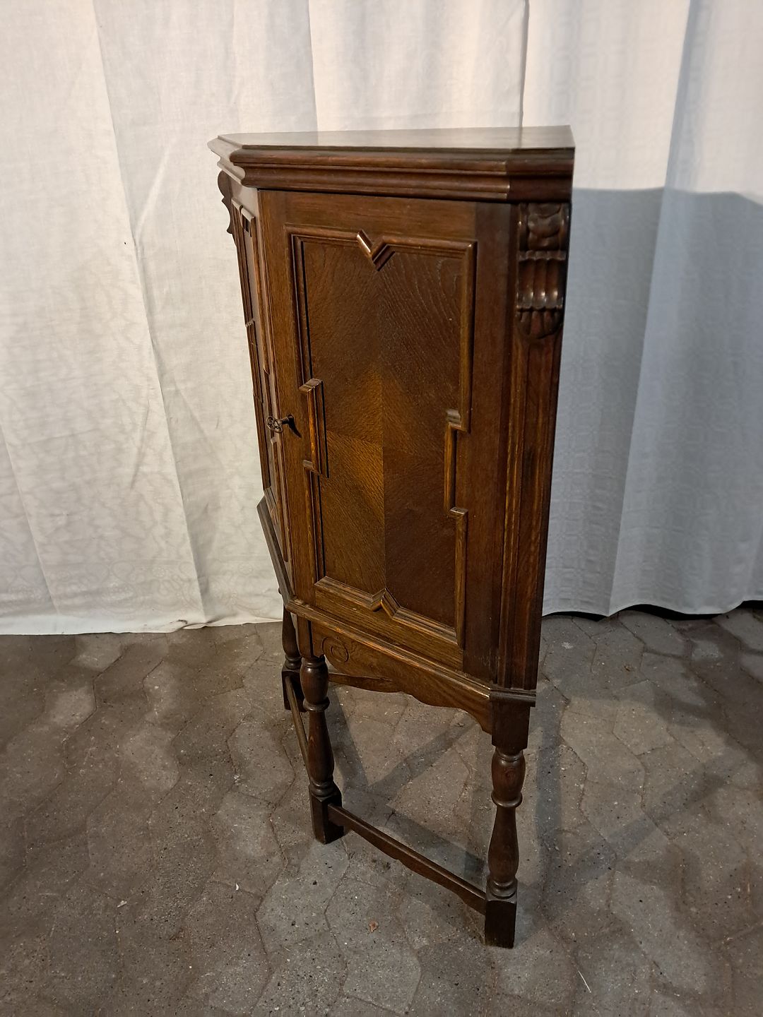 Hjørneskab i fineret egetræ, fra 1980erne.