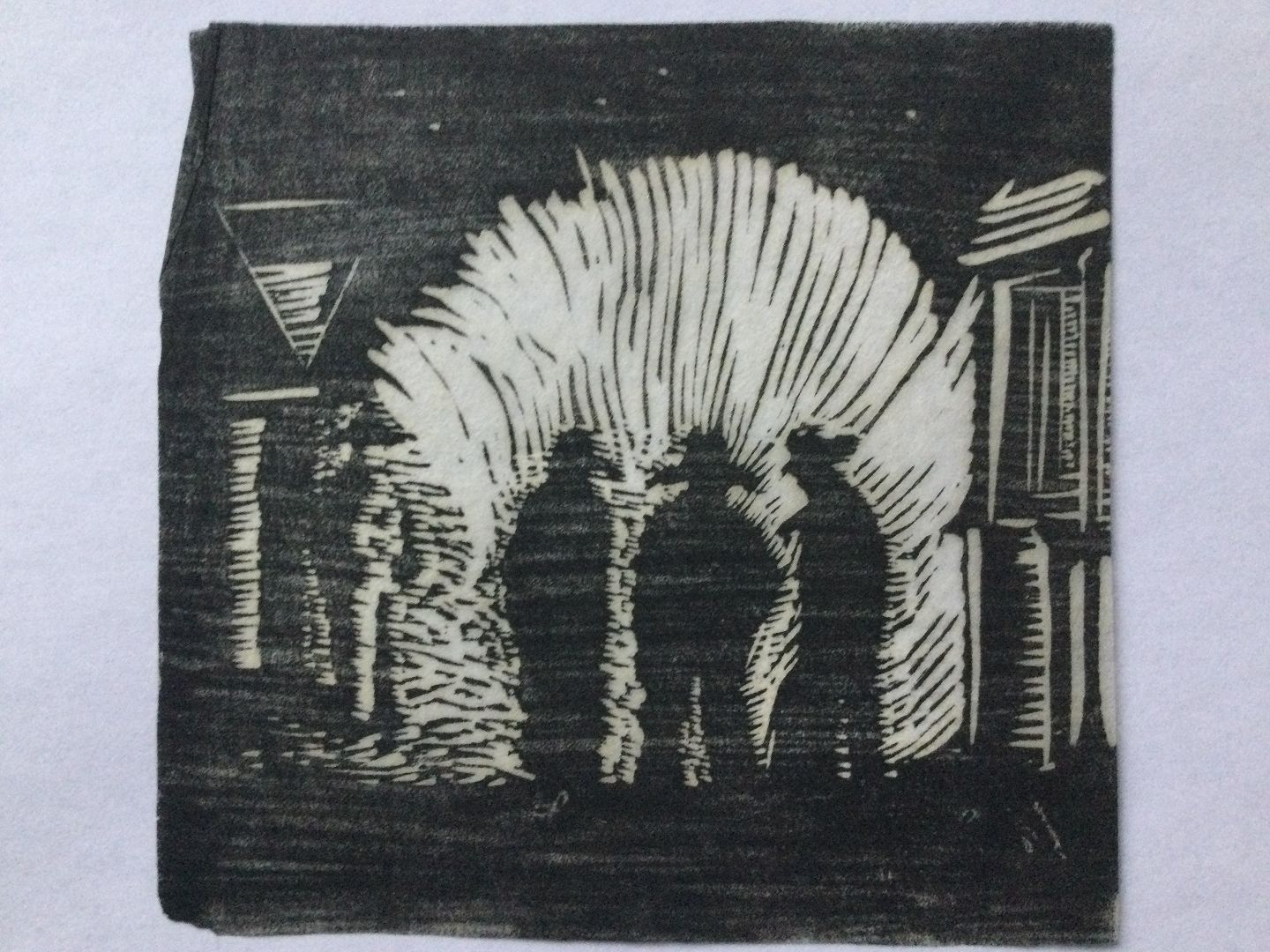 Træsnit af Sven Enselmann - 3 mænd i landskab.