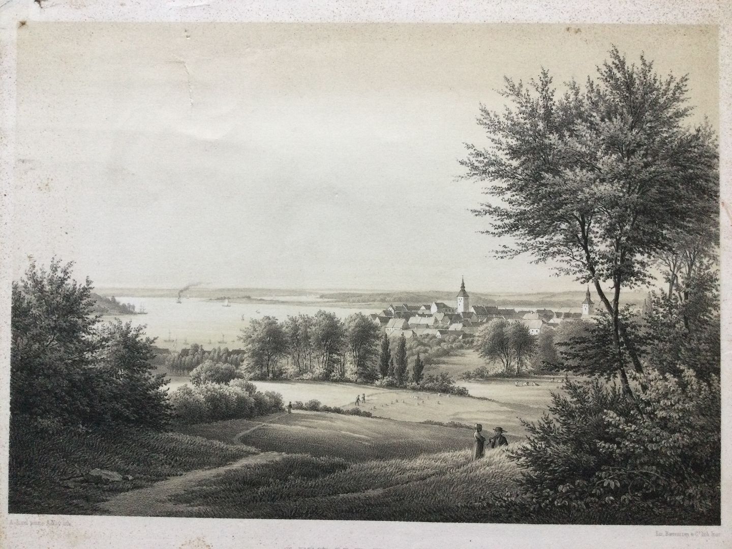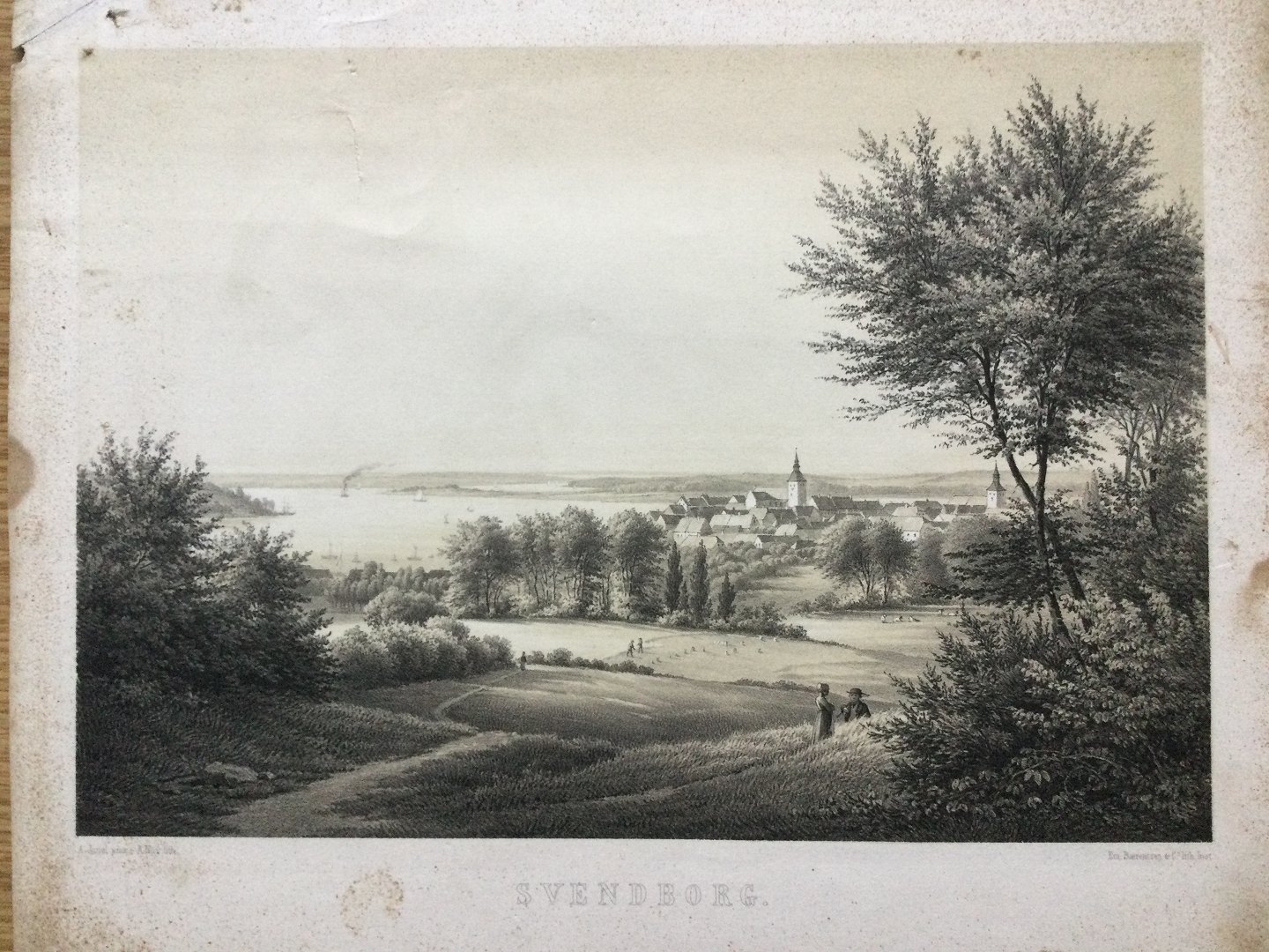 Farvelitografi af A. Nay efter maleri af Andreas Juuel "Parti fra Svendborg med Svendborgsund"