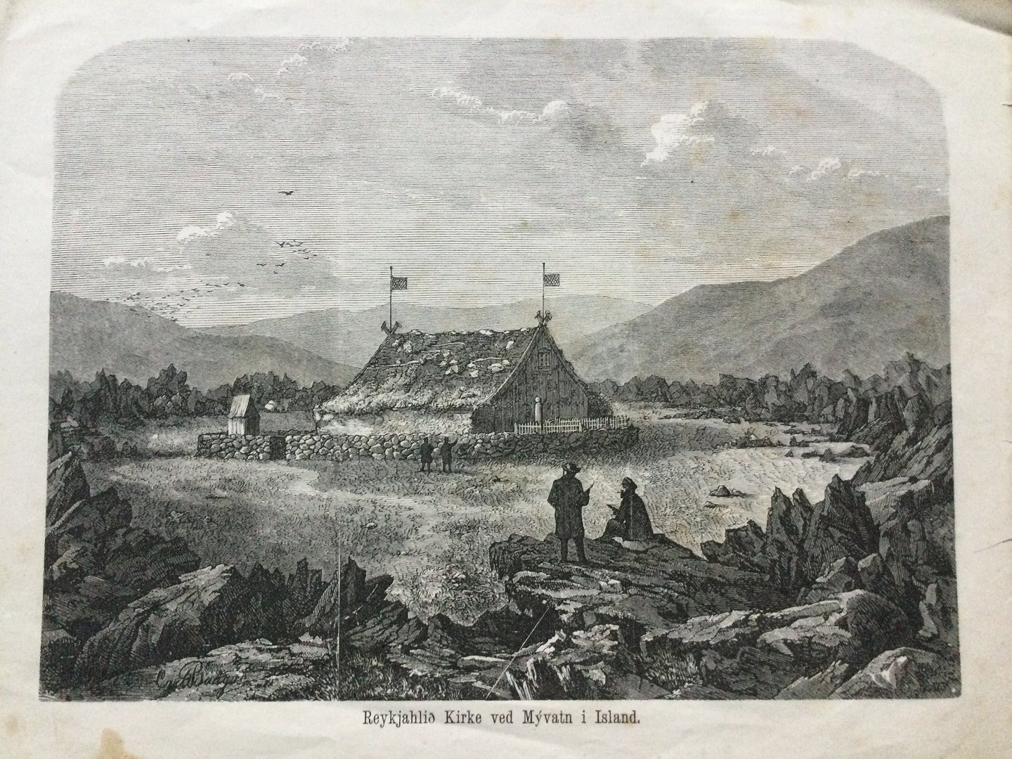 Betegnet "Reykjahlid Kirke ved Mývatn i Island".