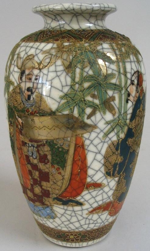 Japanese Satsuma vase, Japan, ca.1900. Craquelle, with polycrome decoration and gold with two men and a gift letter. H: 18.5 cm.