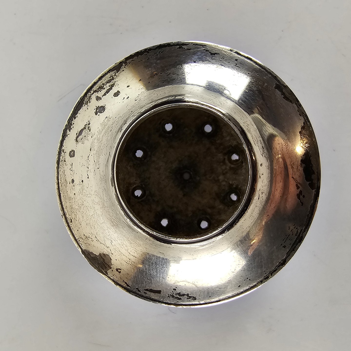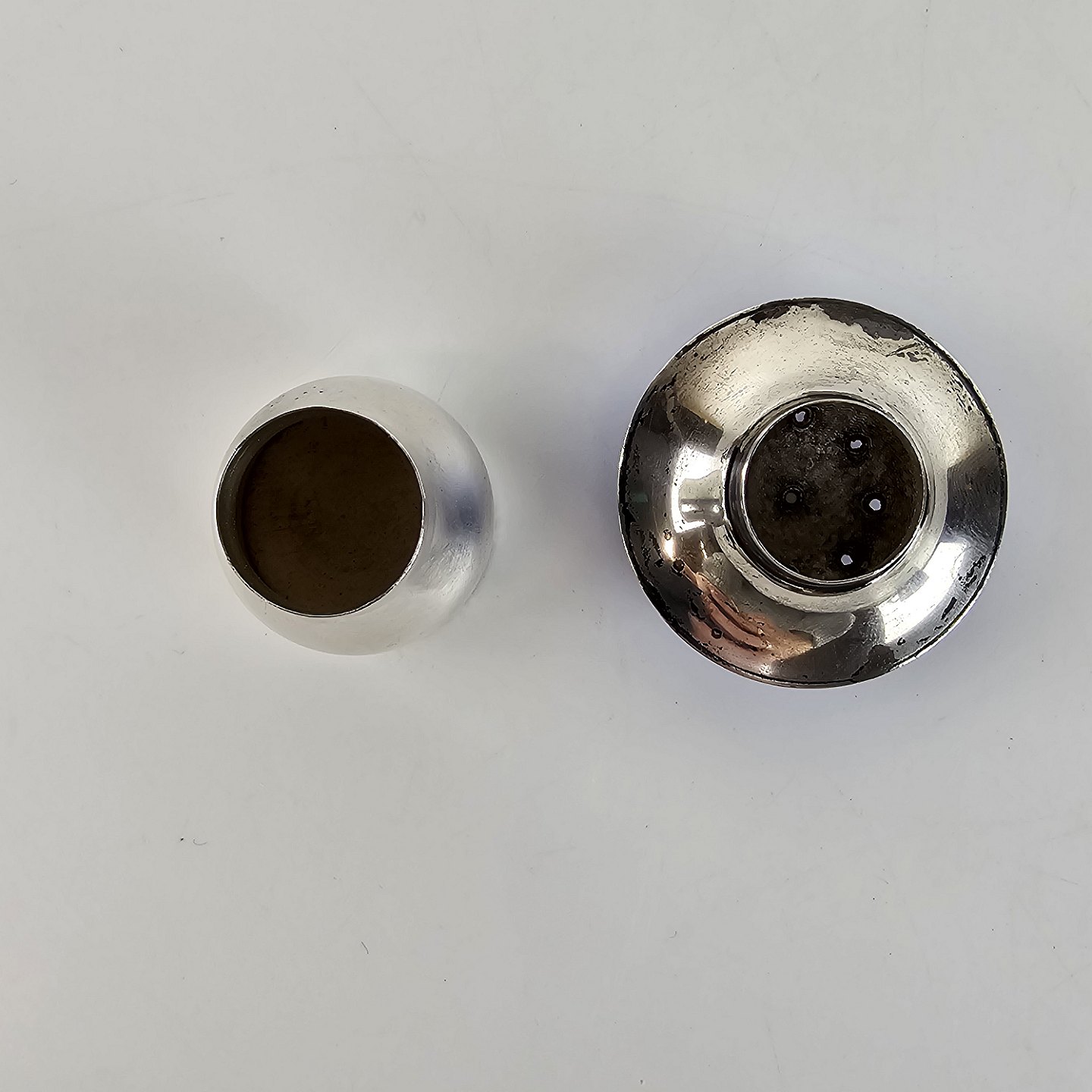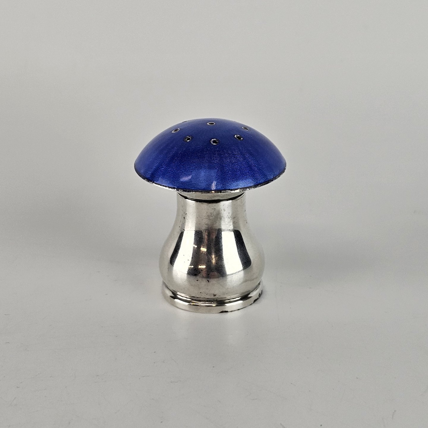 Svampeformet saltbøsse i sterling sølv. Med låg med blå emalje.