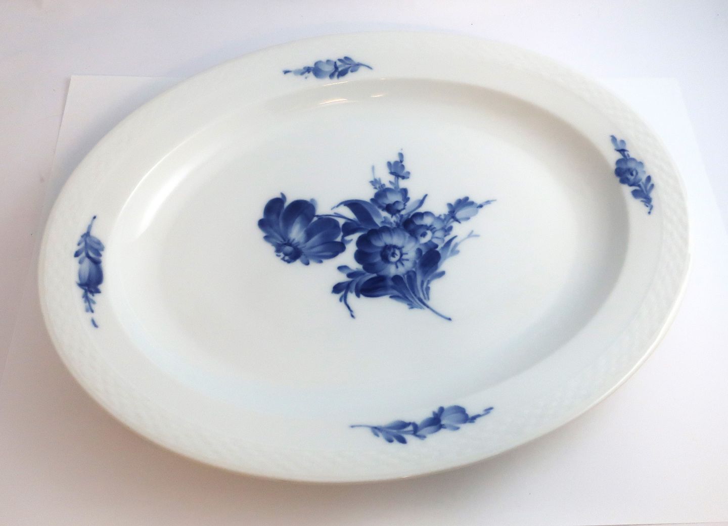 Royal Copenhagen. Blå blomst, flettet. Ovalt fad. Model 8017. Længde 36 cm. Bredde 29 cm. (1 sortering).