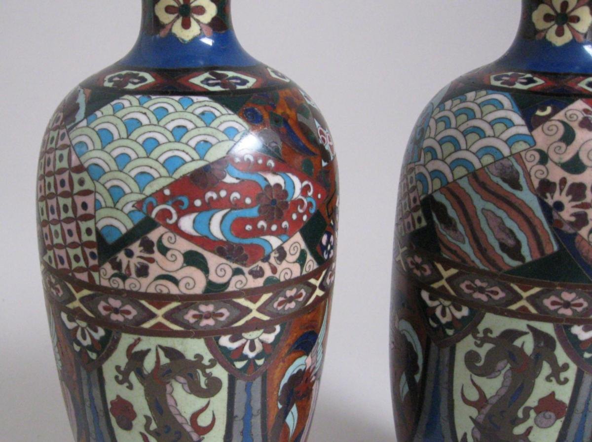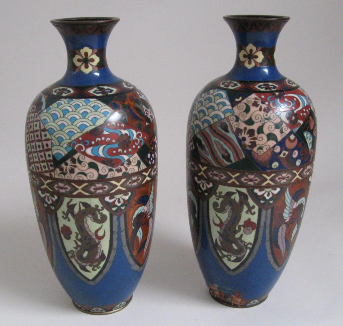 Par antikke cloissonné vaser, Japan, 19. årh. Næsten identiske. Med dekorationer i form af fugle (ho-ho fuglen), drager og geometriske mønstre. 19. årh. H.: 30,5 cm. Begge med slagmærker.