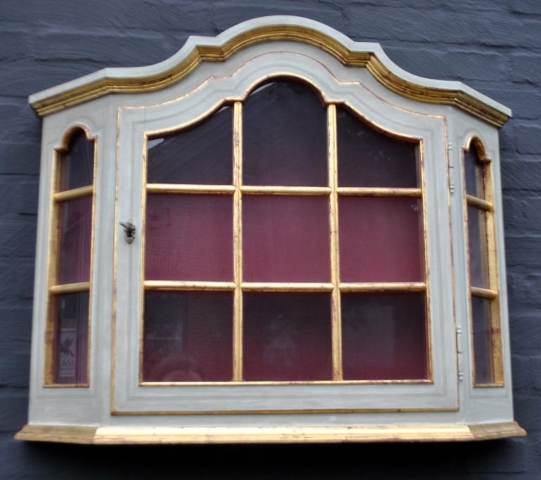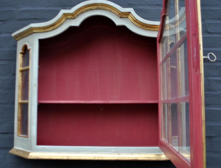Hænge vitrine, 20. årh. barokform. Danmark. Lyst malet med forgyldte lister. H: 64 cm. B: 80,5 cm. D: 19 cm.