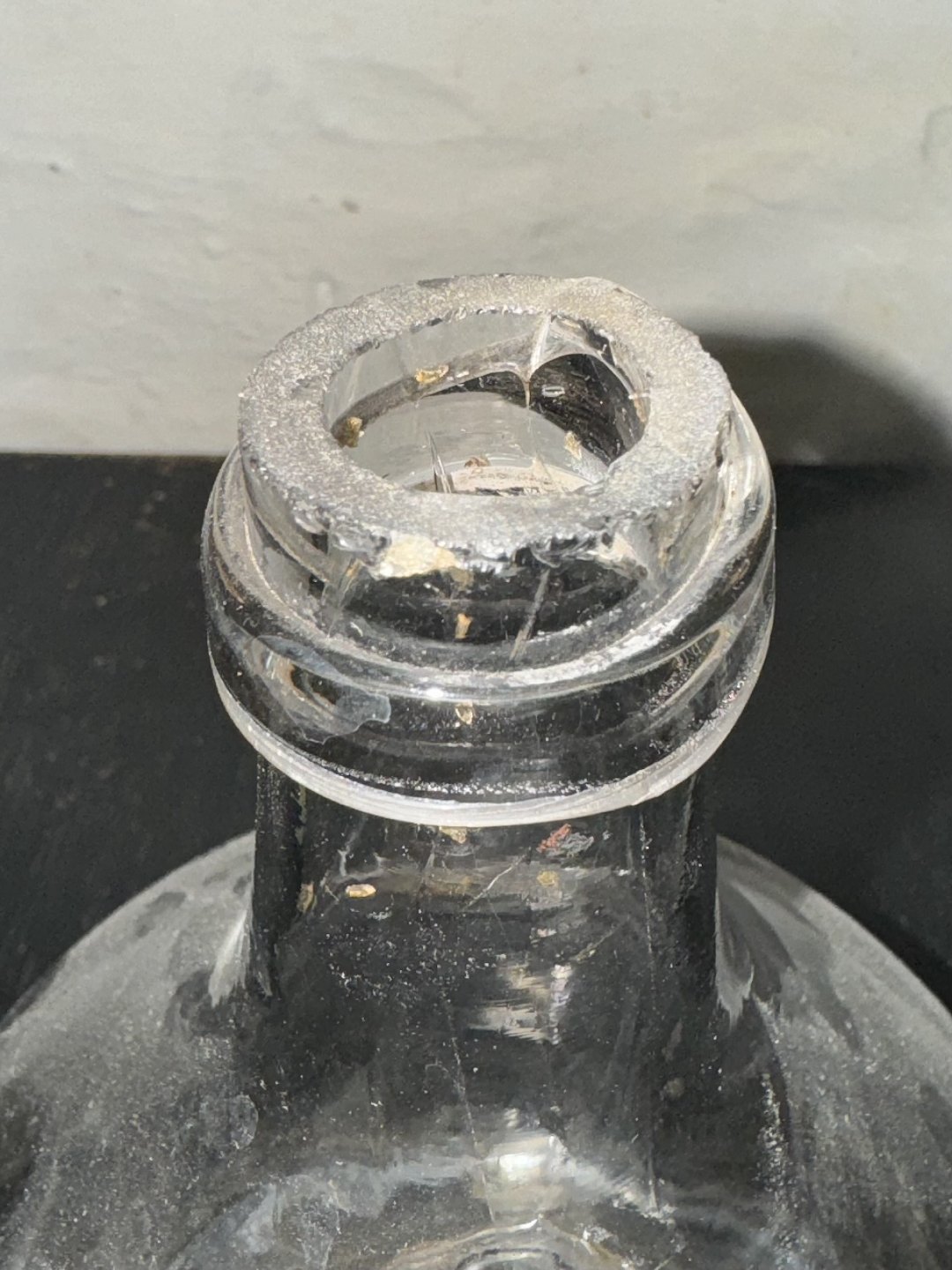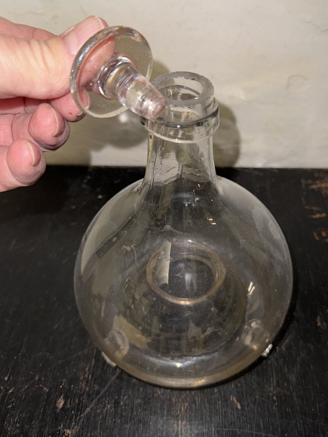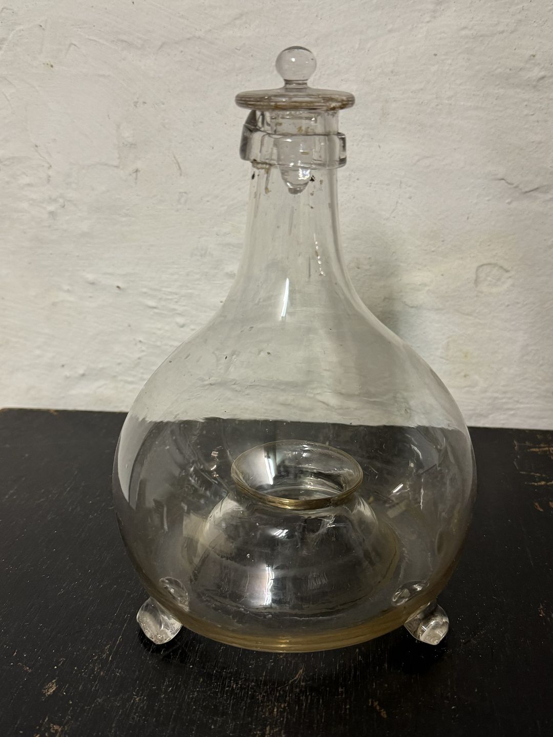 Fluefanger i glas med tilhørende prop. Har lidt beugsspor, især ved toppen, åbningen. Ellers i fin stand. Fra slutningen af 19. Århundrede. H. 23 cm incl. prop