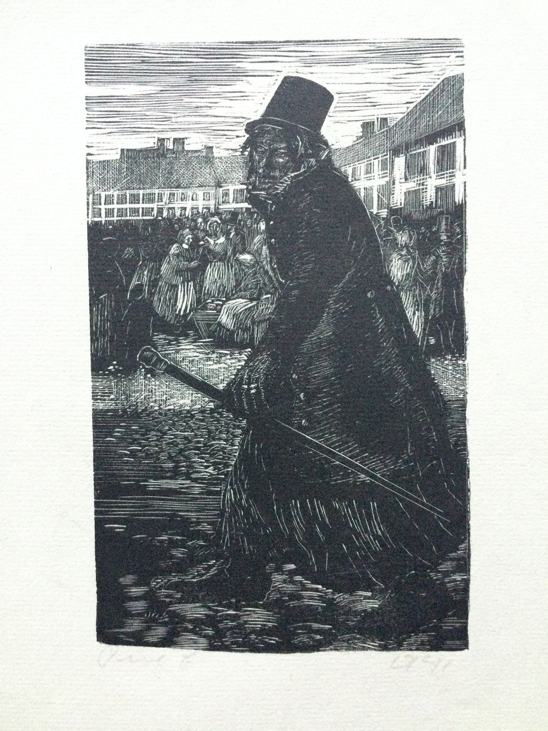 Træsnit af Povl Christensen 1941 - Gående mand i by.