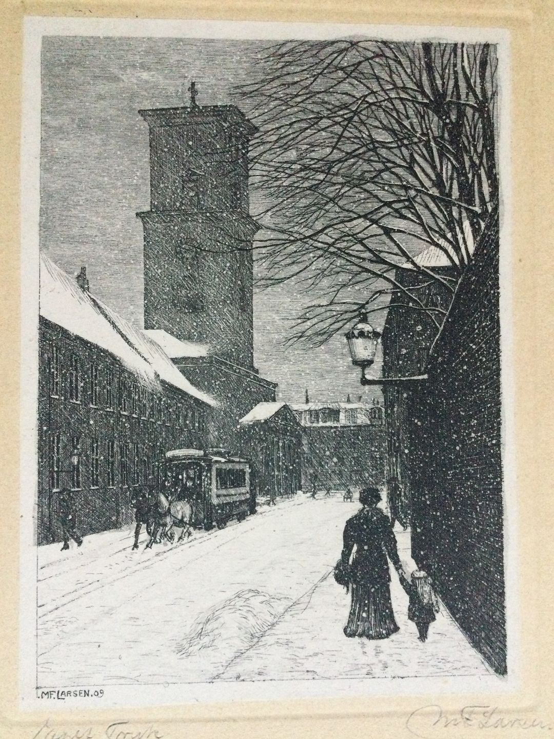 Radering af Martin F. Larsen - Vor frue Kirke i København, Vinter 1909.
