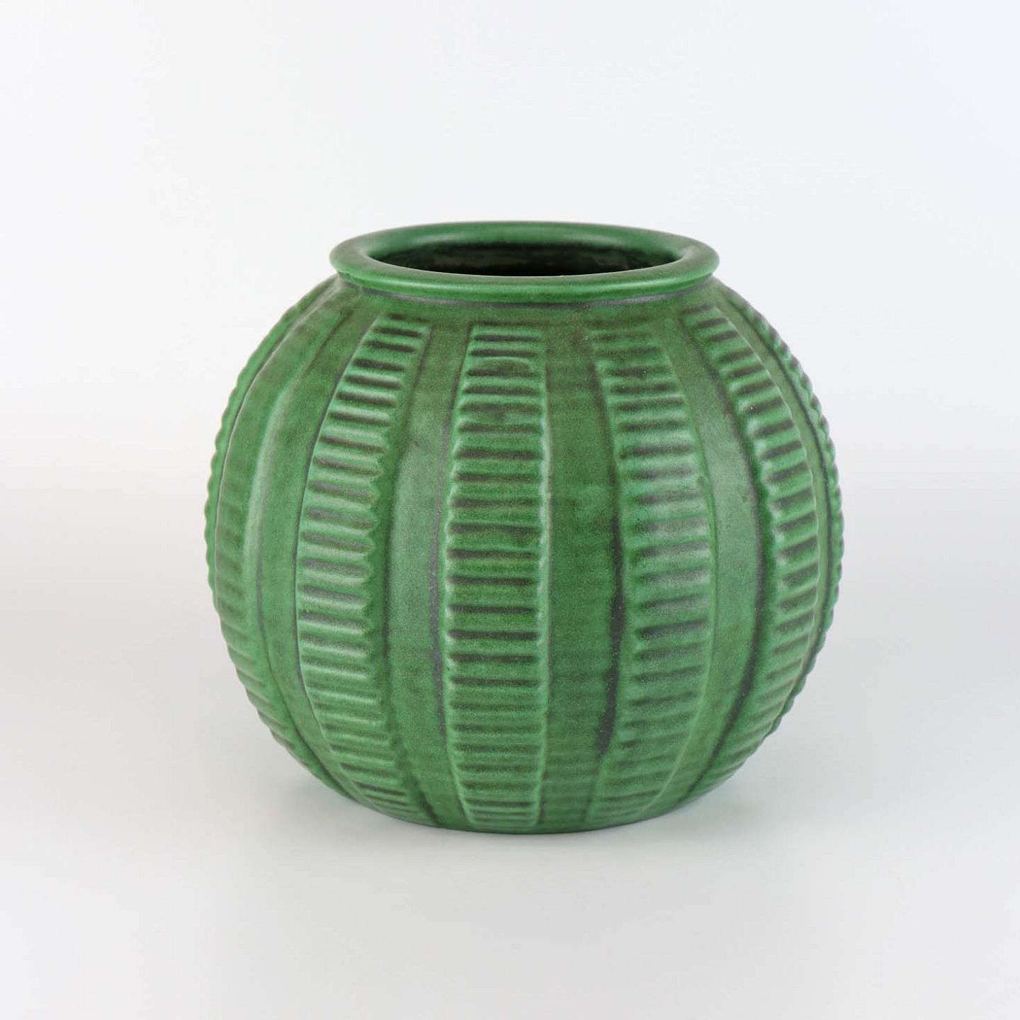 Kuglevase i grøn glaseret keramik med rillet mønster
